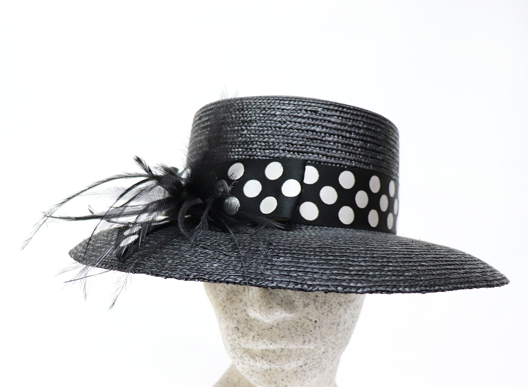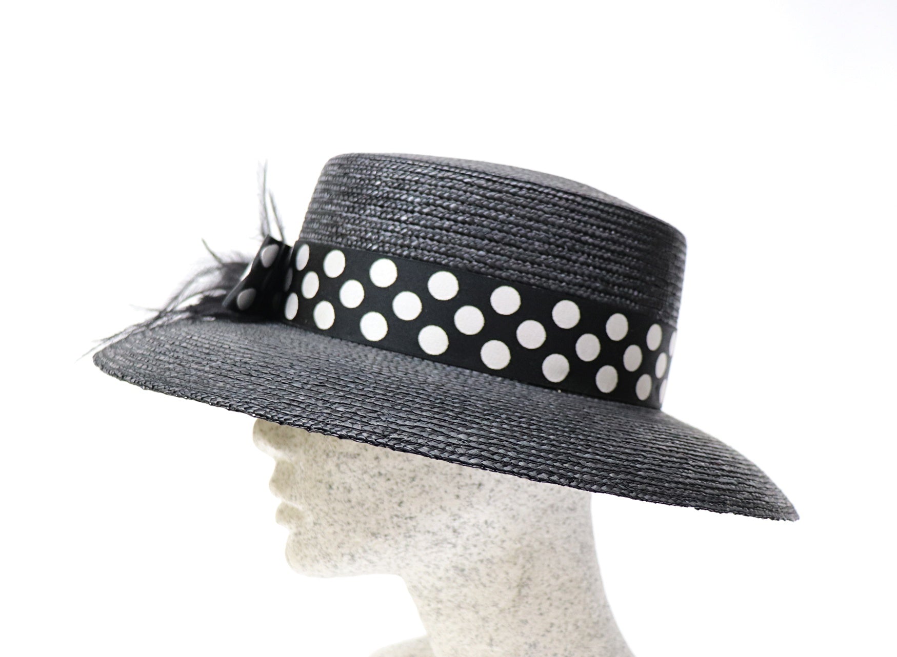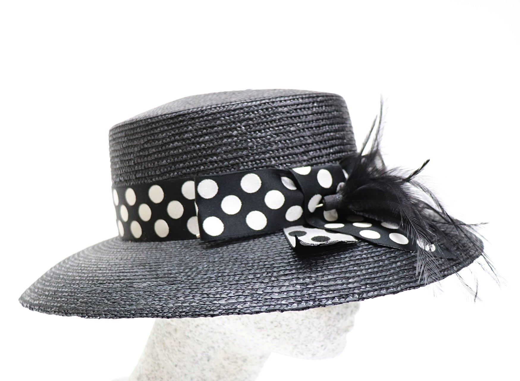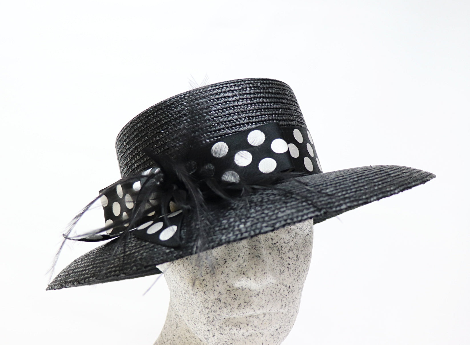 garniert mit einem schwarzen Band und weißen Punkten - seitlich vorne eine Schleife mit einer Emu Hutnadel