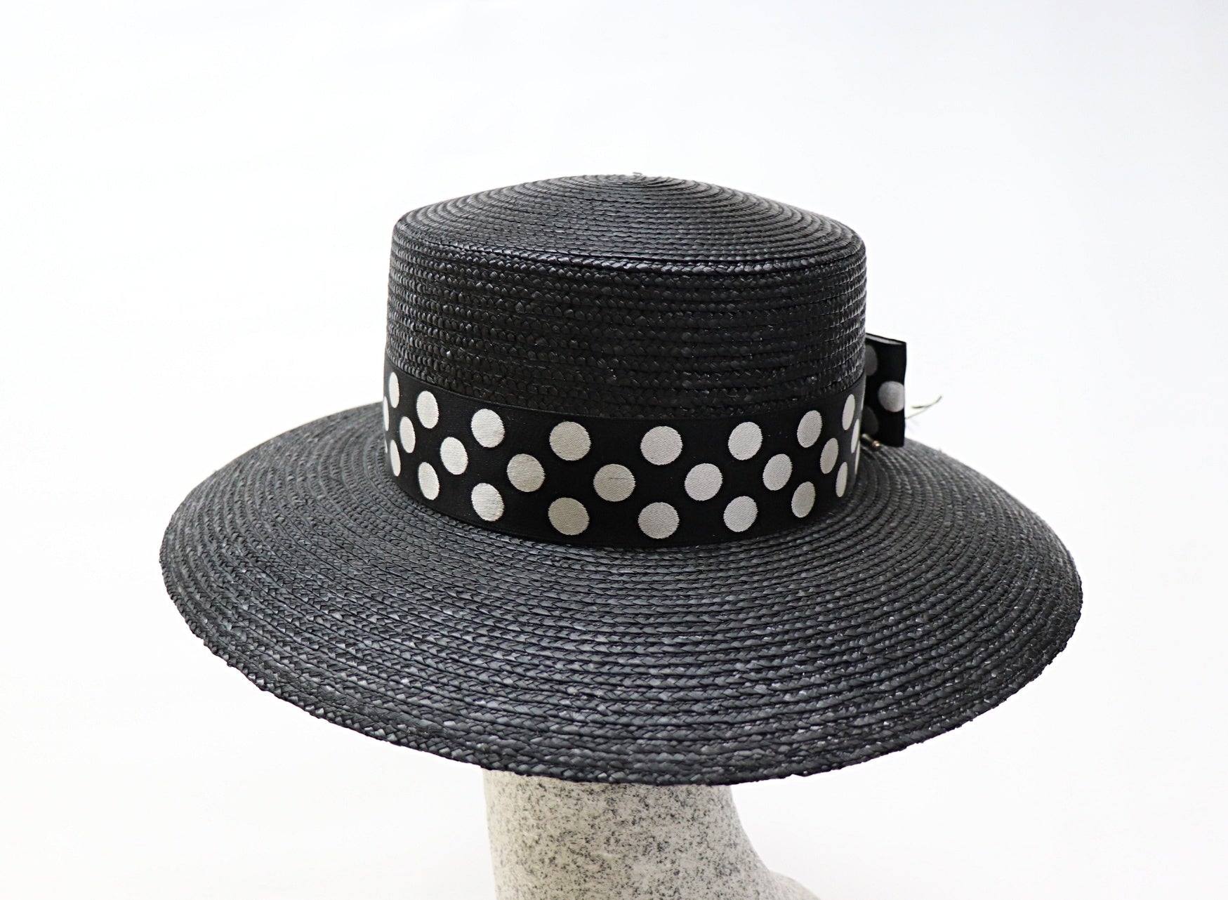 Glocke aus schwarzem Bortenstroh mit gepunktetem Band