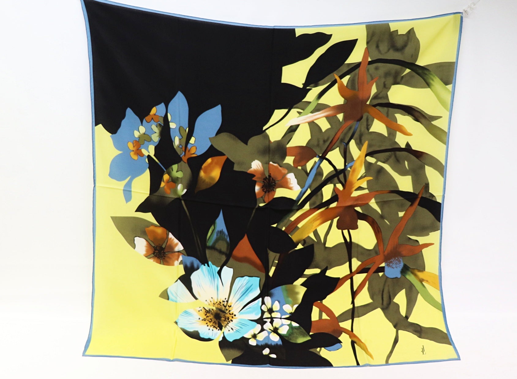 Silk scarf with large blue flowers on kiwi - black