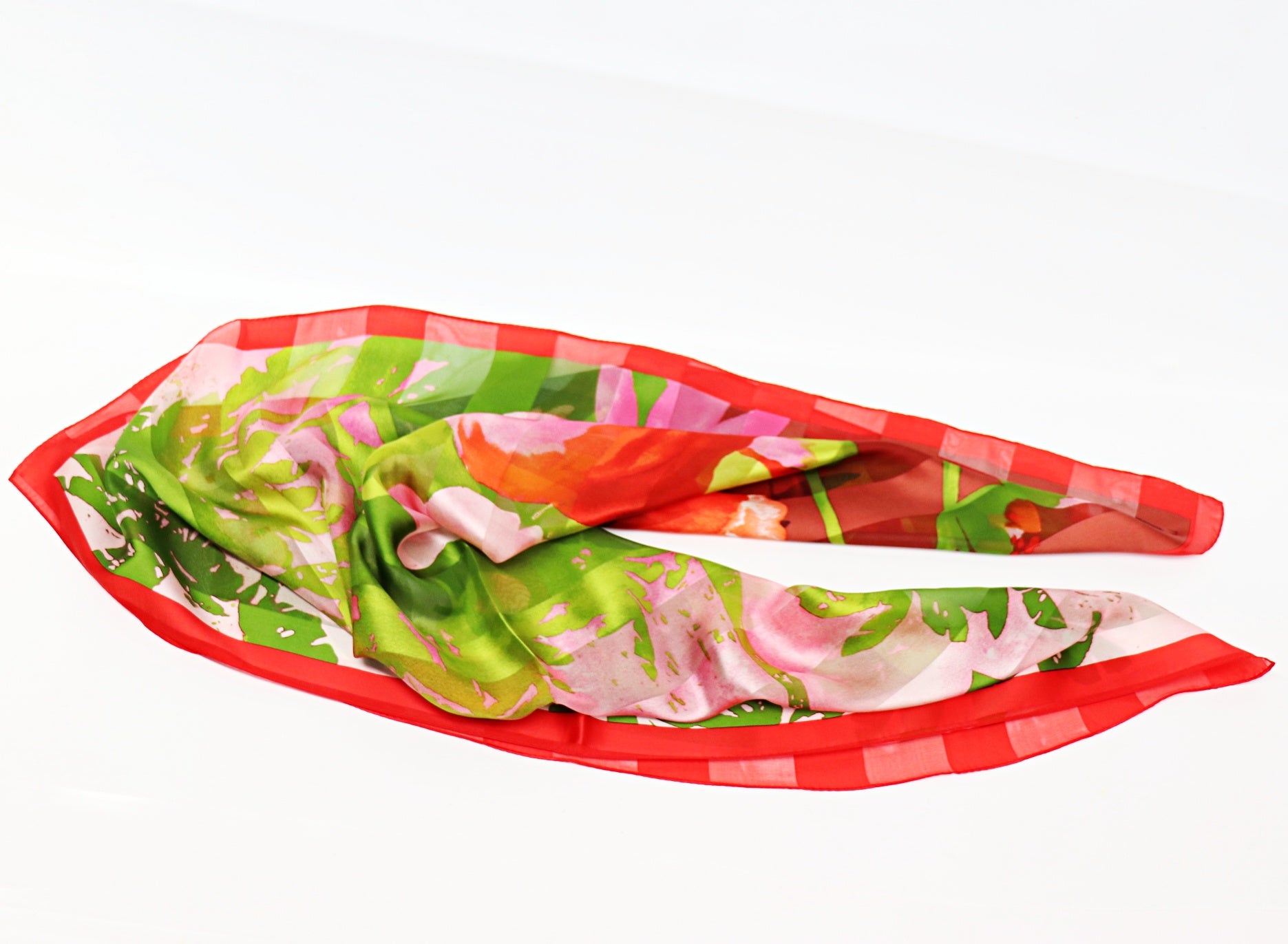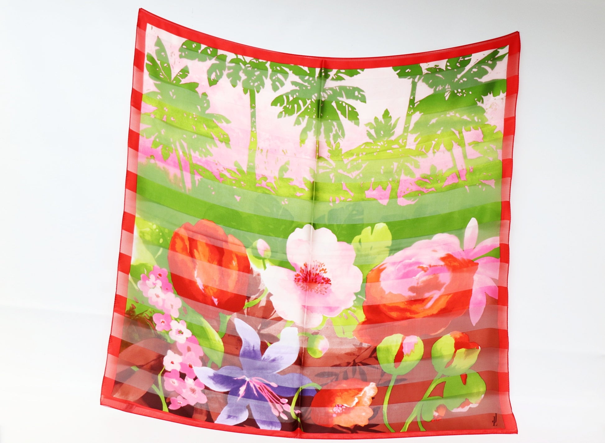 Silk scarf with flowers and palm trees in red - green - rose - purple