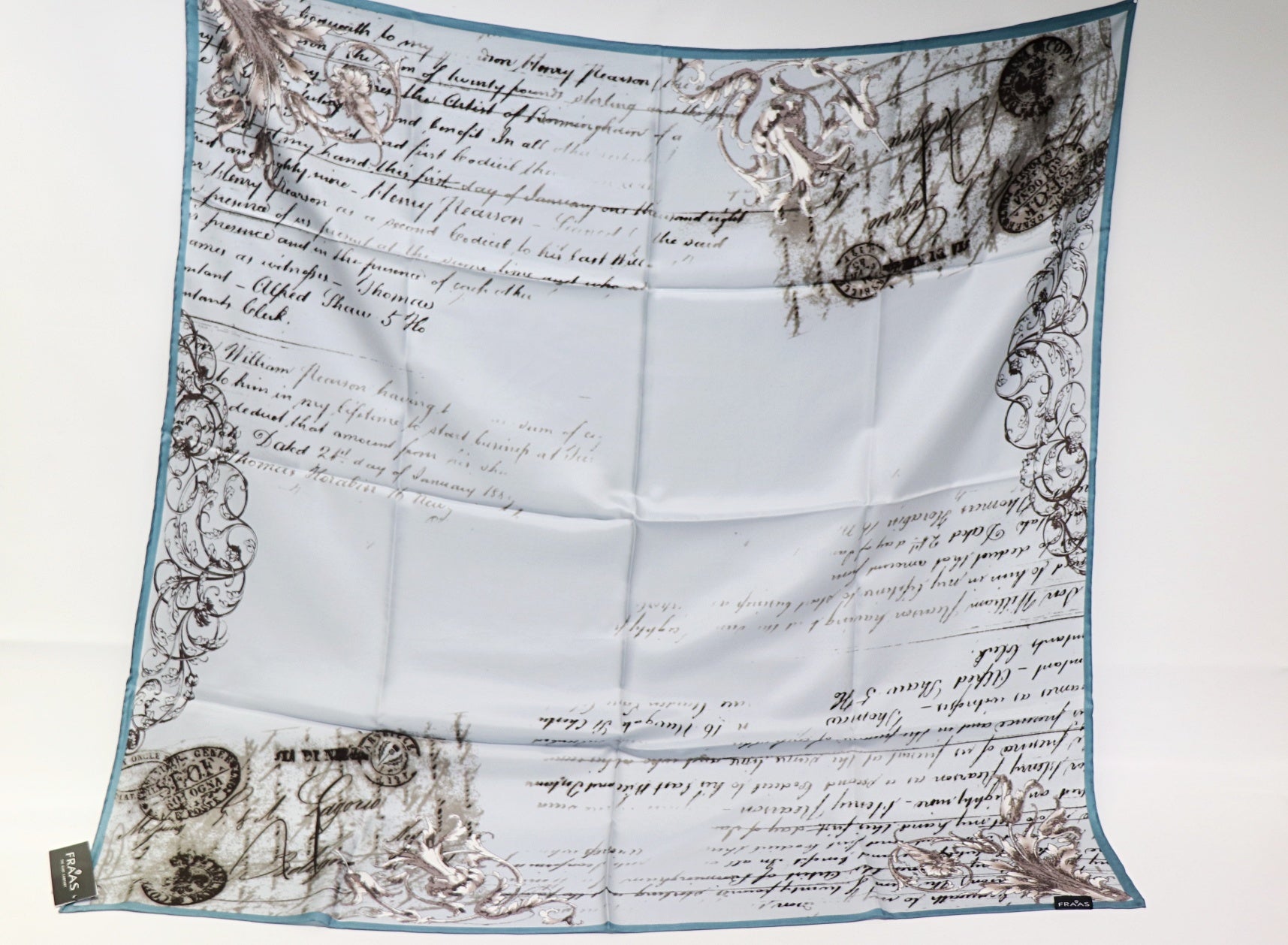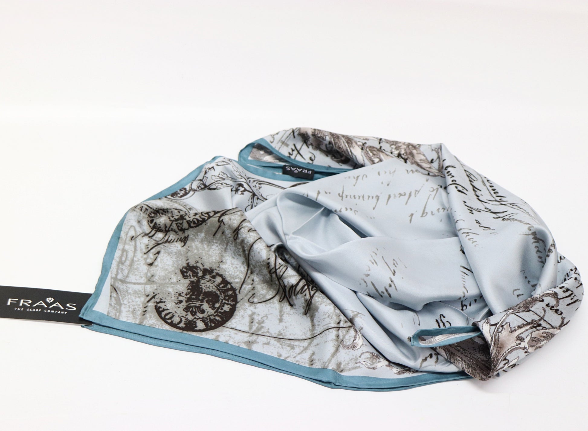 large silk scarf with calligraphy (old writing) in grey - petrol
