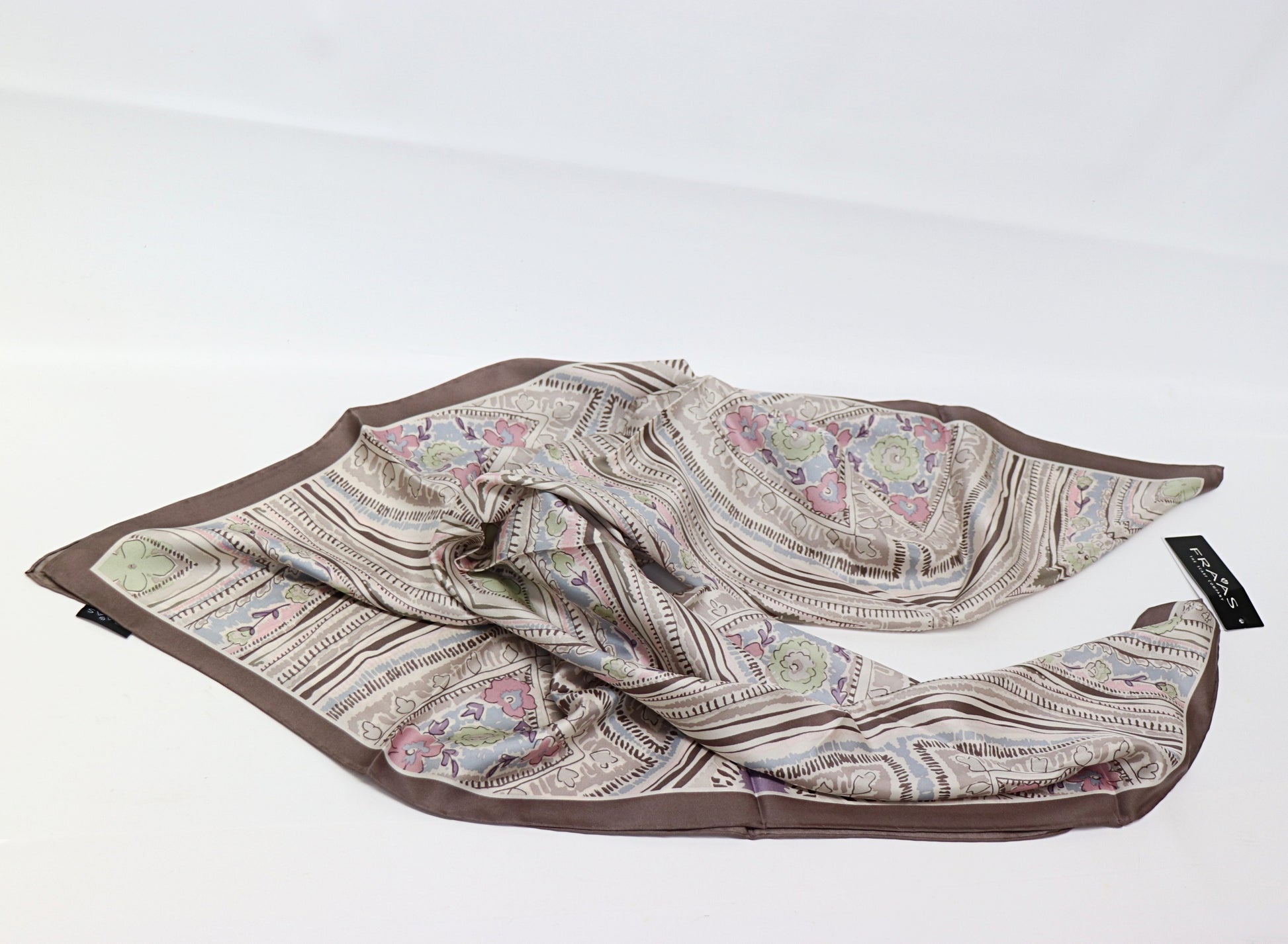 Silk scarf with pastel-colored flowers in geometric patterns - the edge in taupe