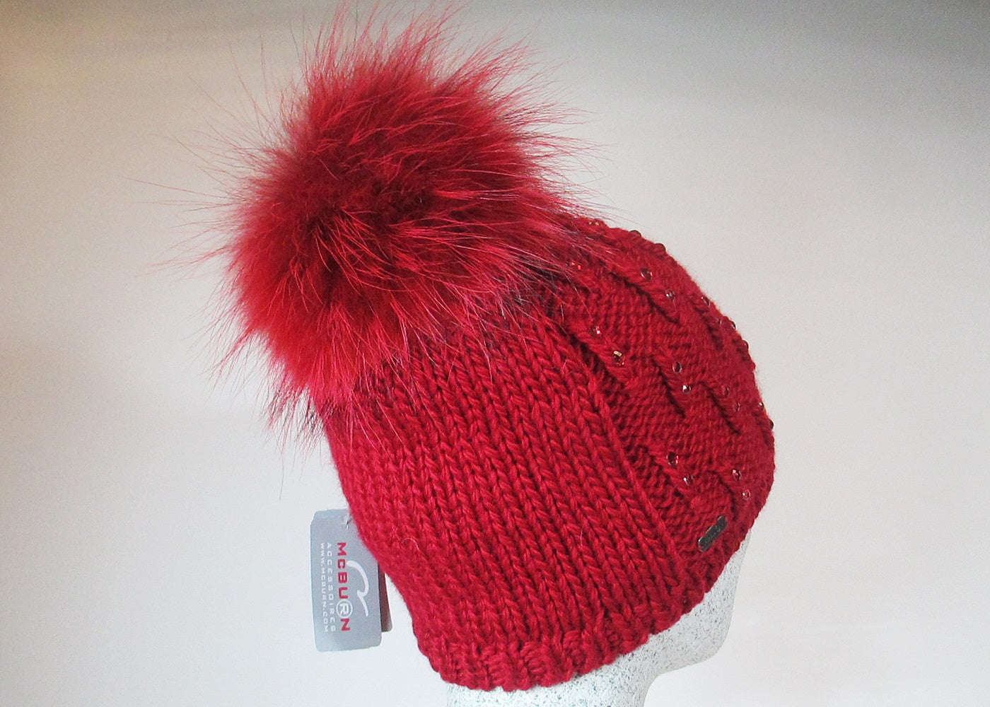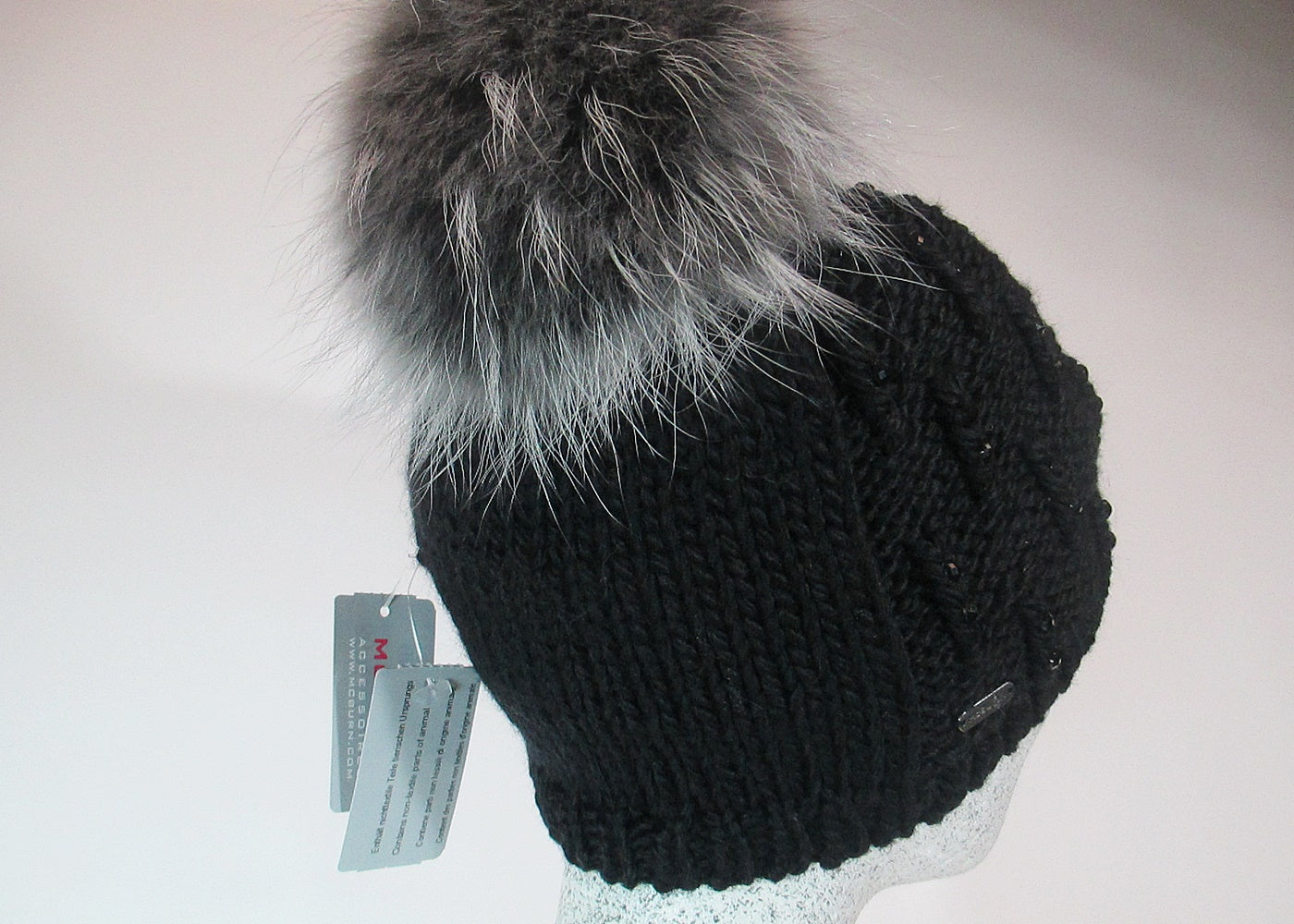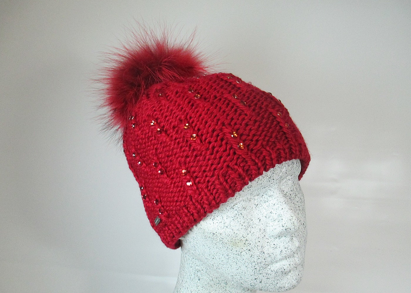 fashionable beanie with colored rhinestones and a beautiful Finnracoon bobble - real fur
