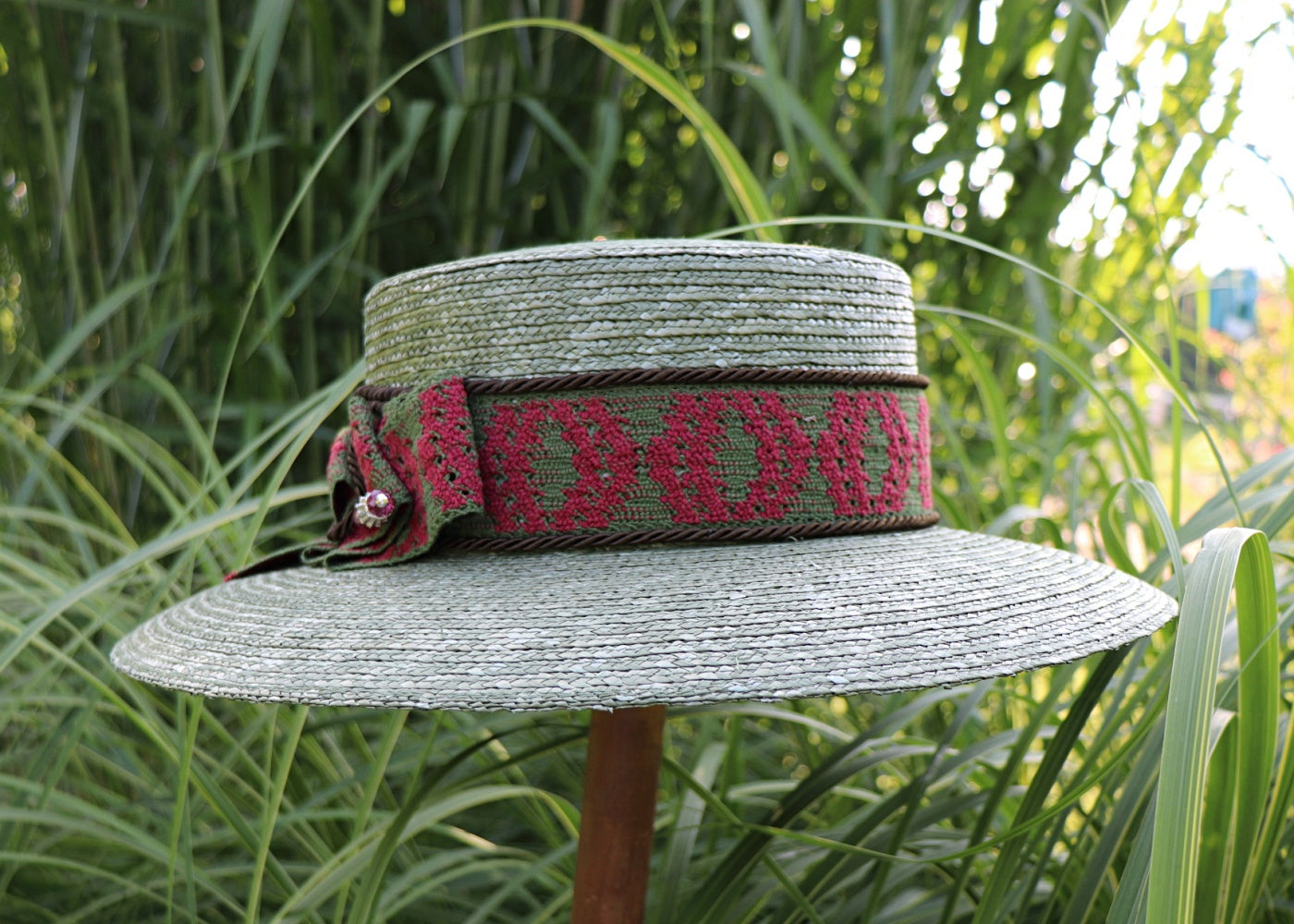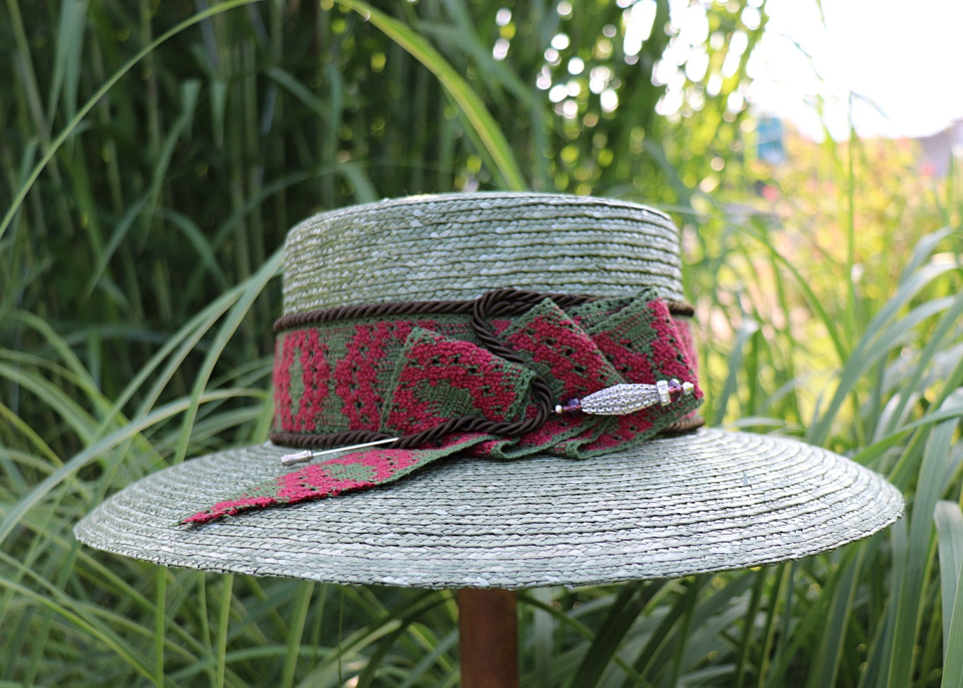 Bortenstrohhut oliv - mit geklöppeltem Band
