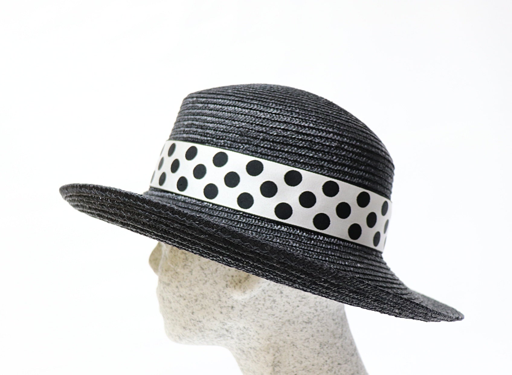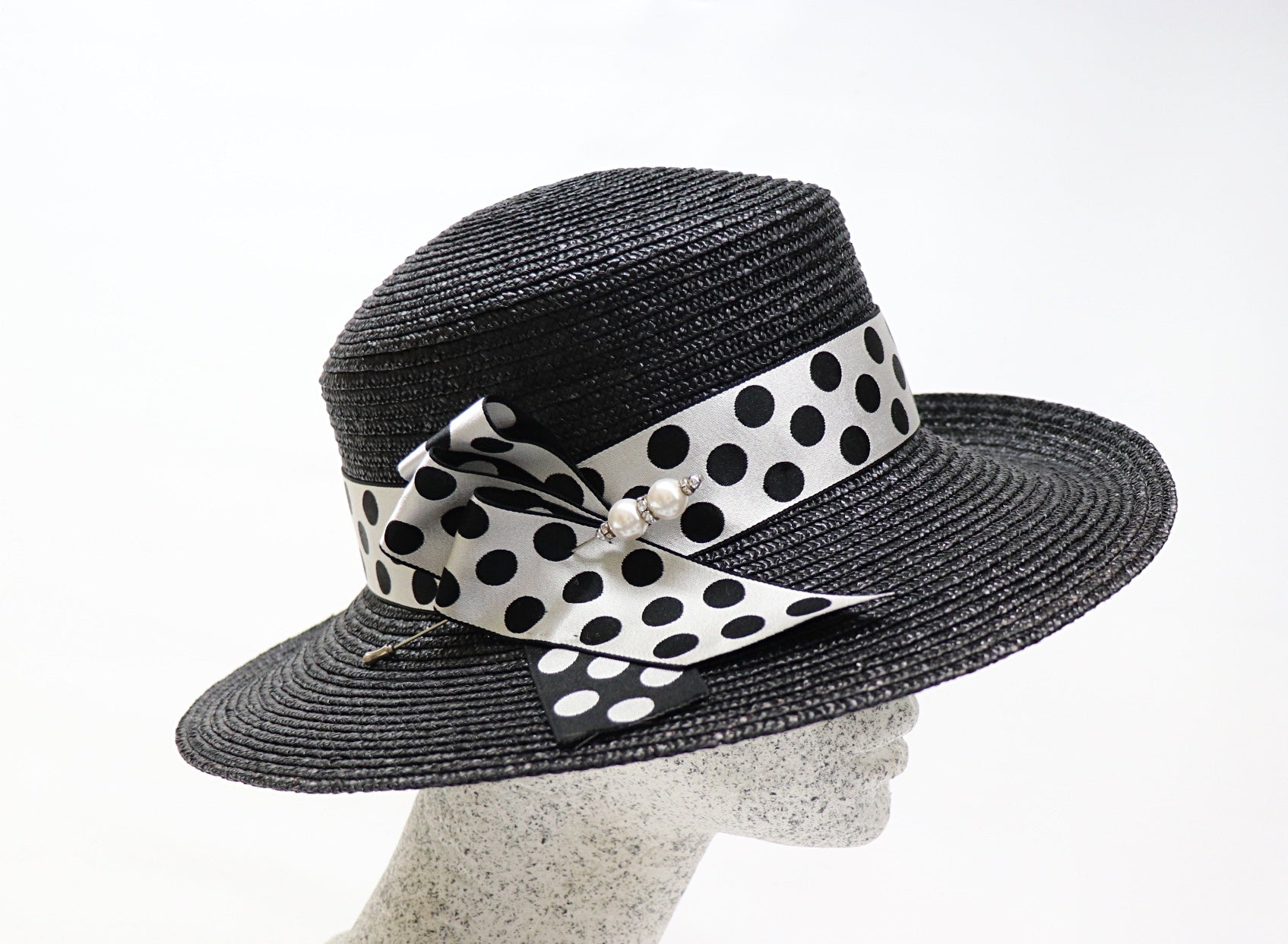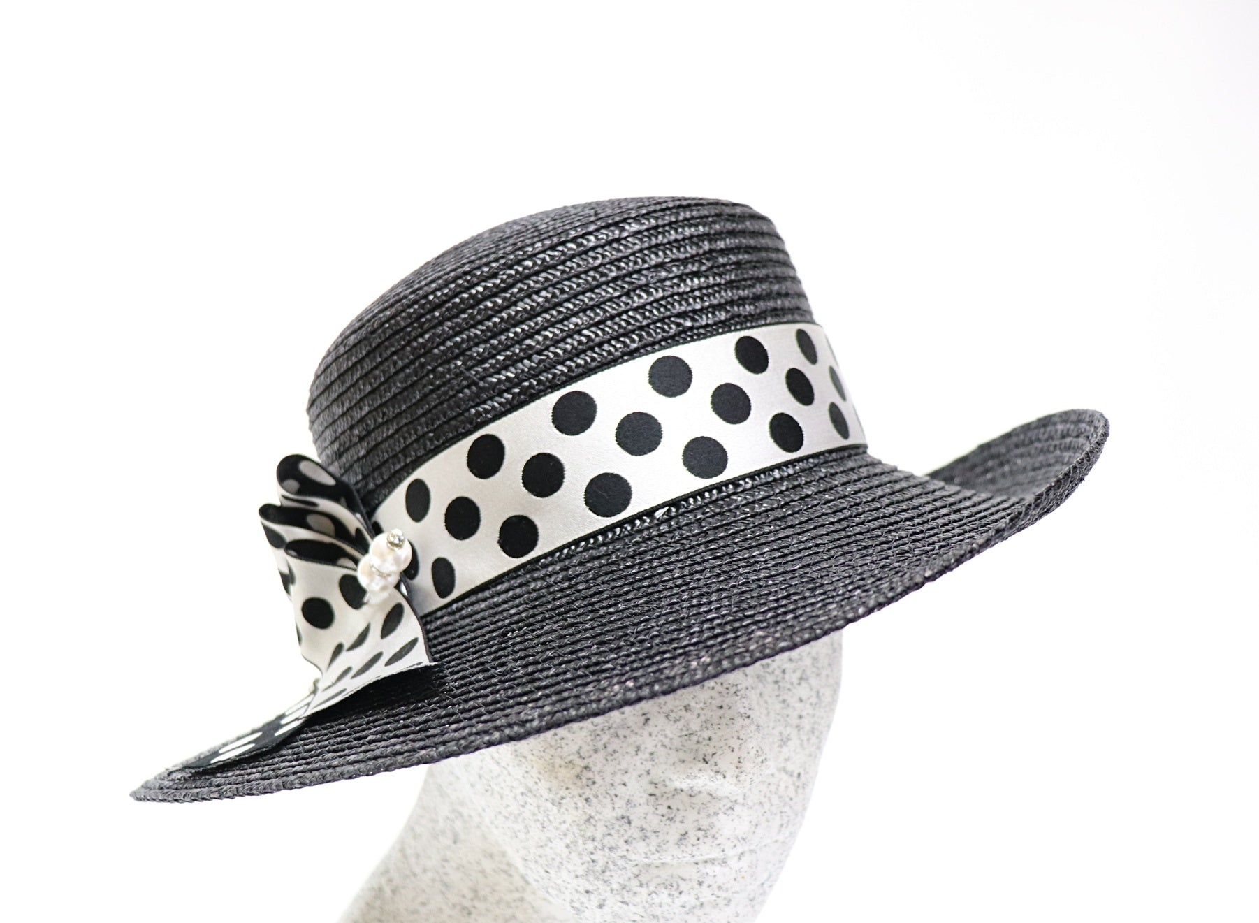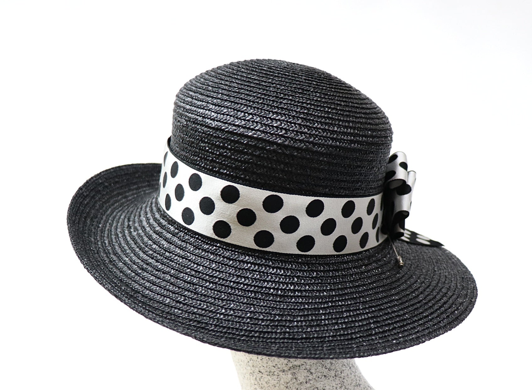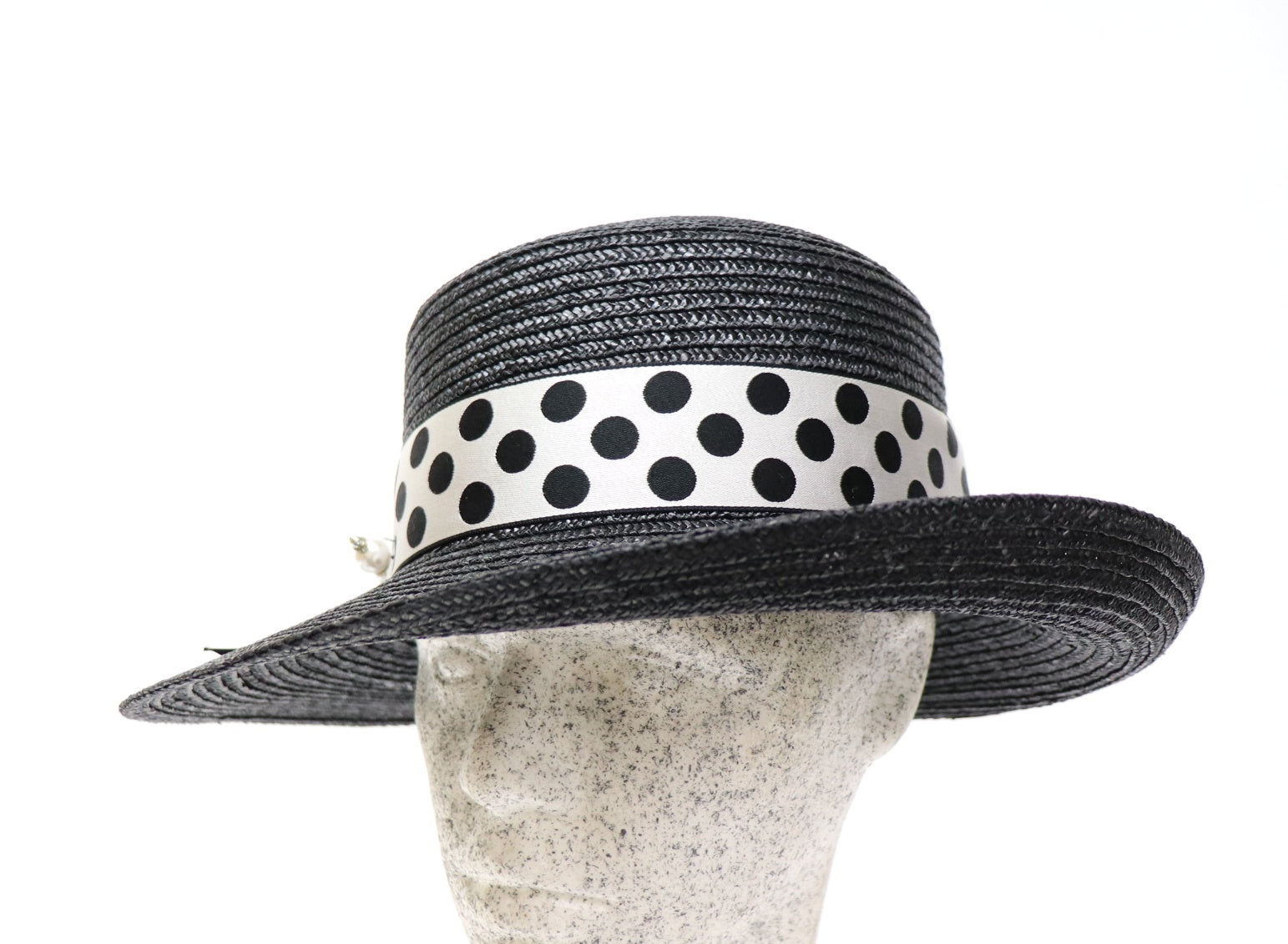 garniert mit einem weißen Band mit schwarzen Punkten - an der Seite Schluppen mit einer Hutnadel