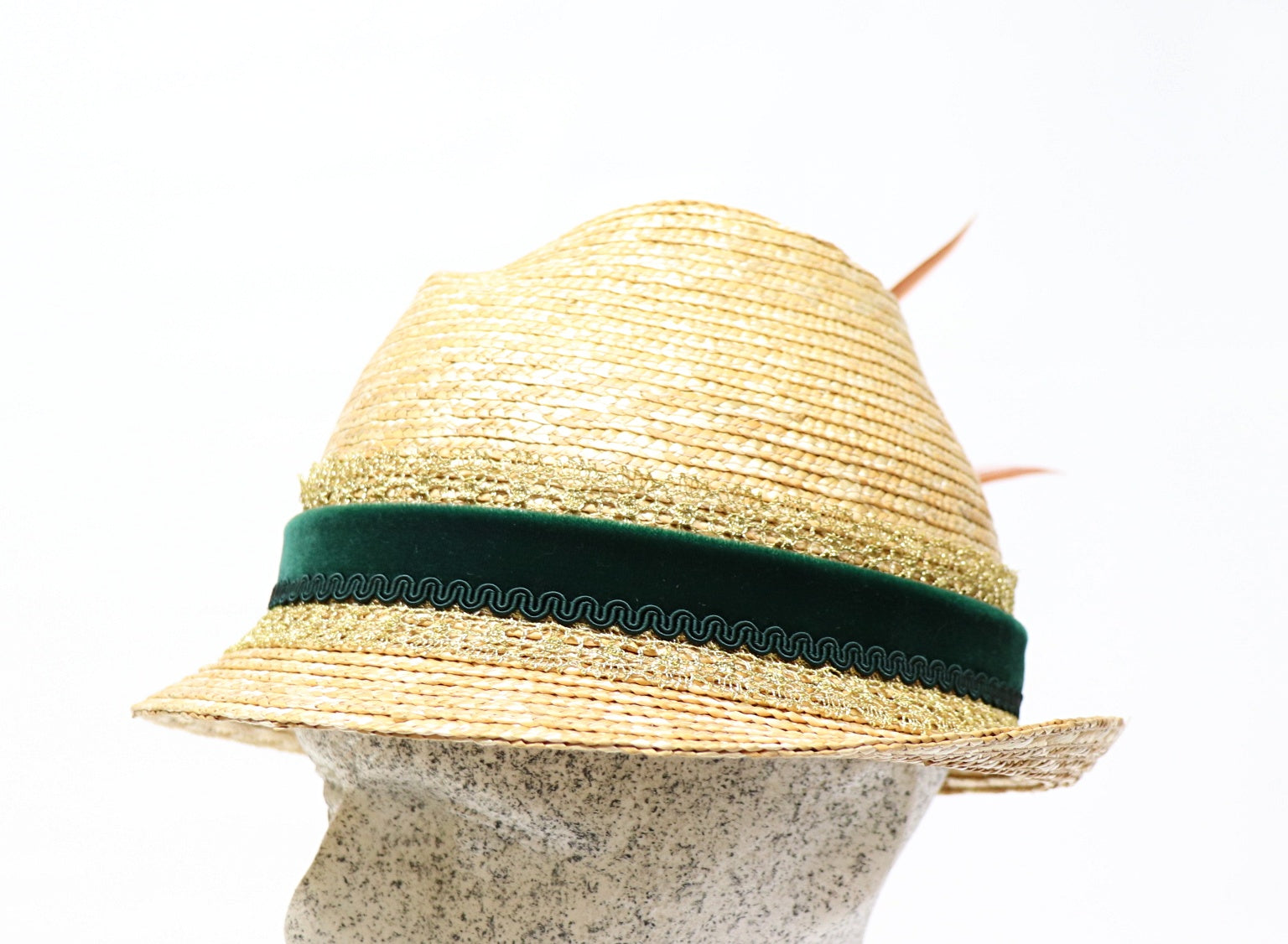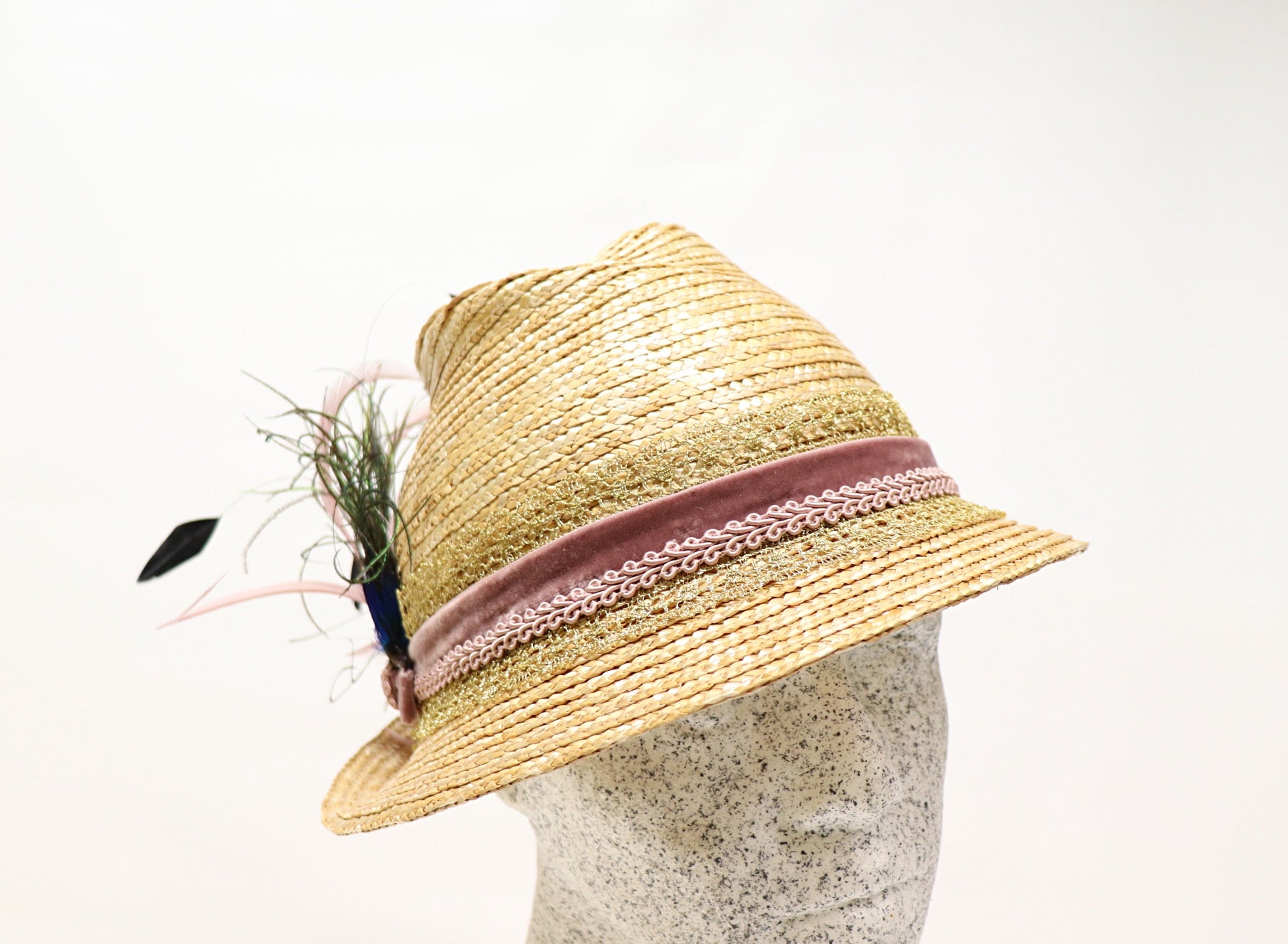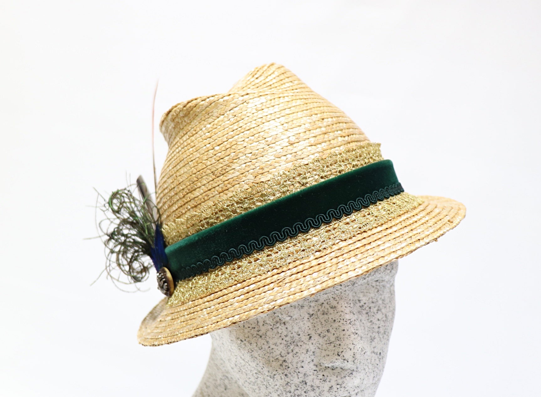 Dirndelhut aus natur Bortenstroh in modischer 6er Form mit Federn