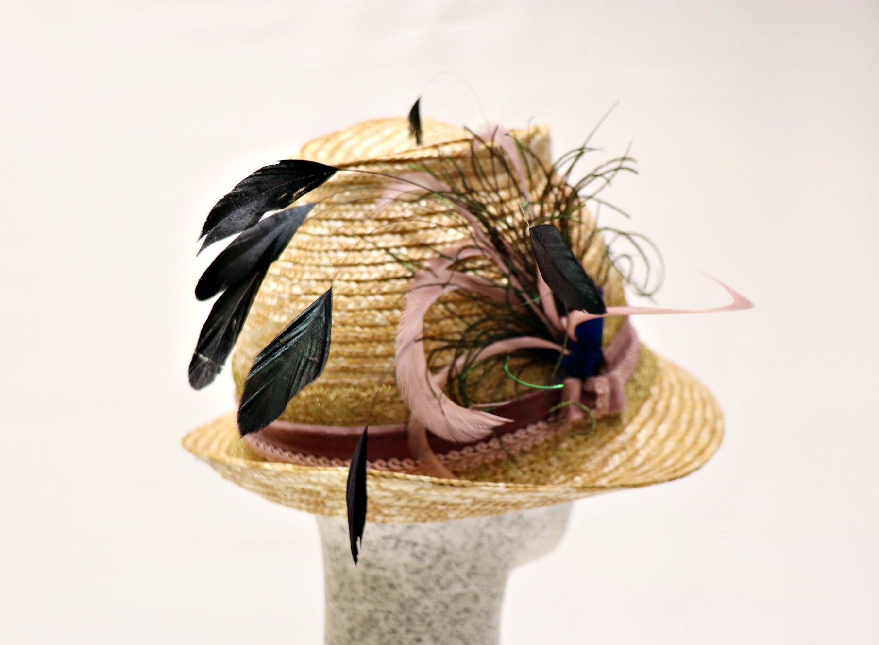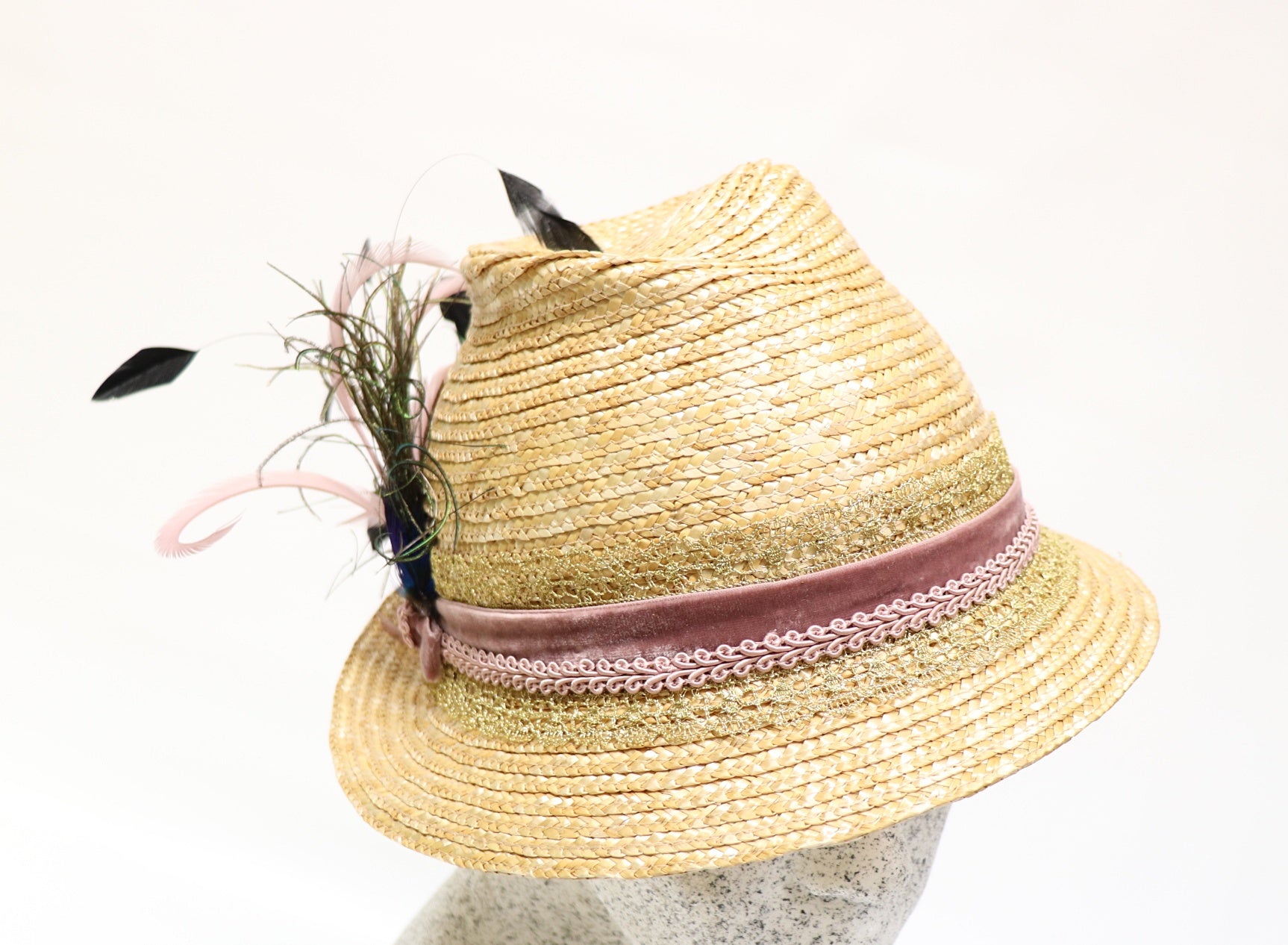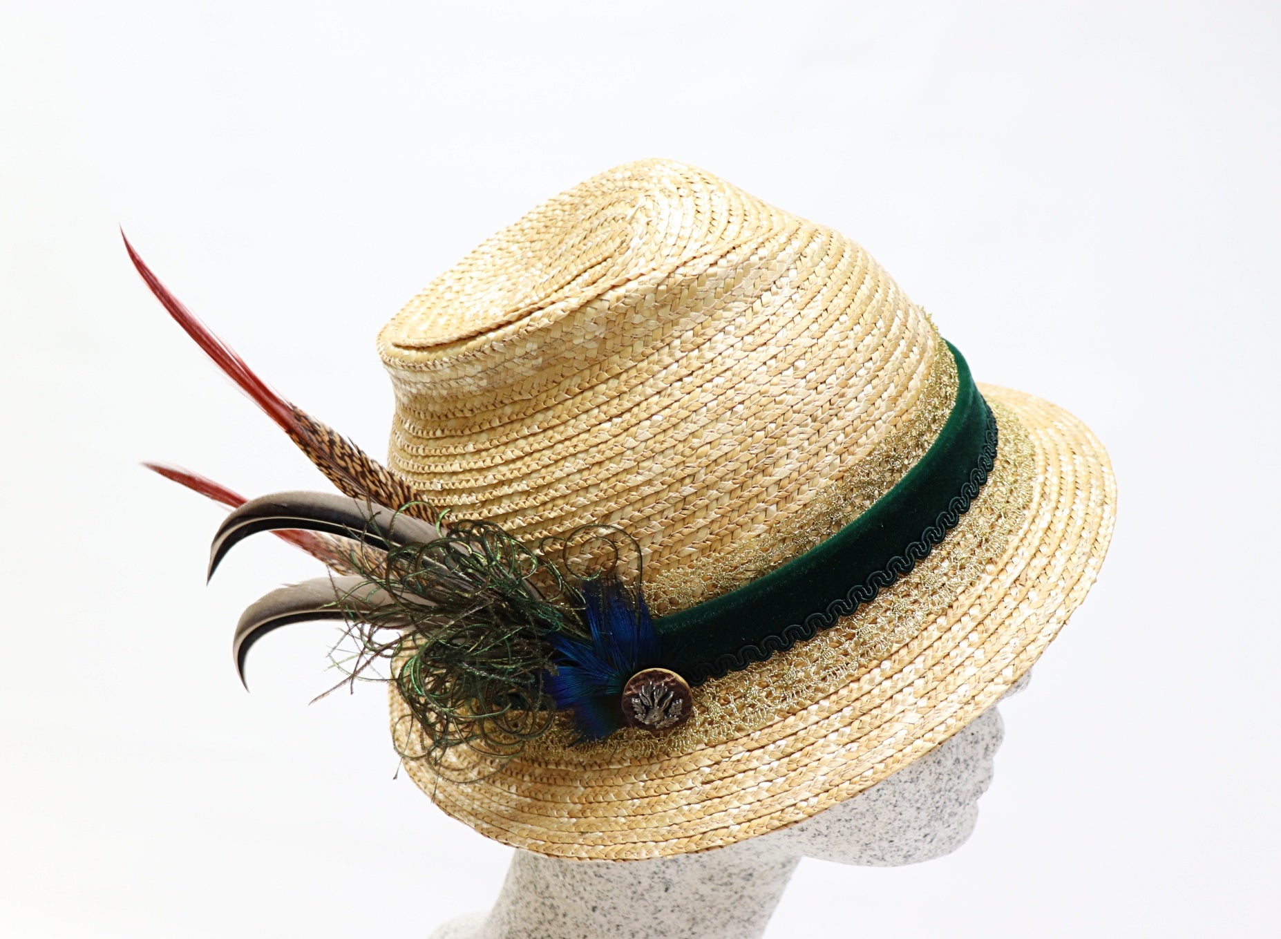Dirndelhut aus natur Bortenstroh in modischer 6er Form mit Federn
