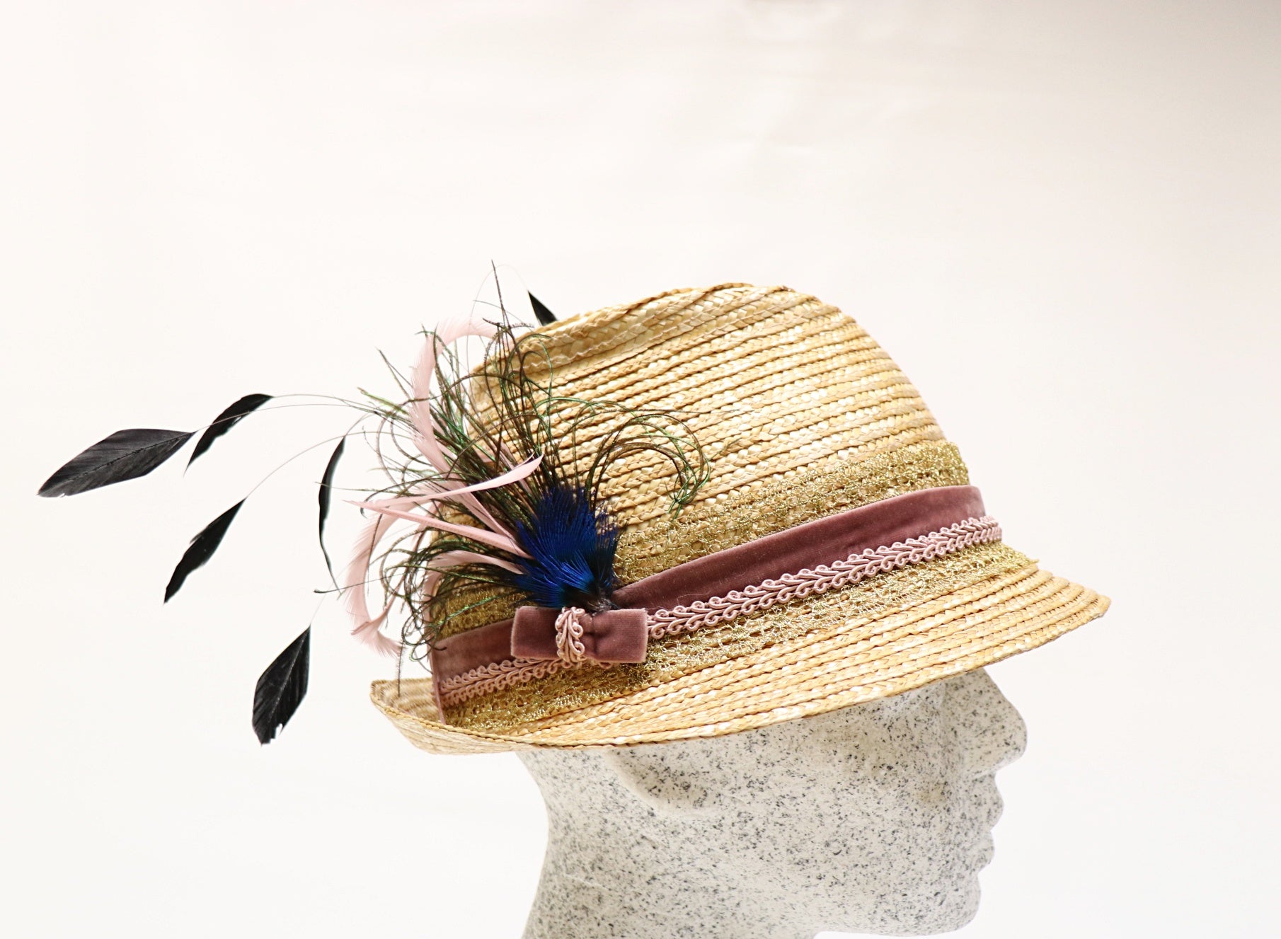 aufwendig garniert mit feiner Goldborte - Samtband - Bordüre und einem tollen Federgesteck