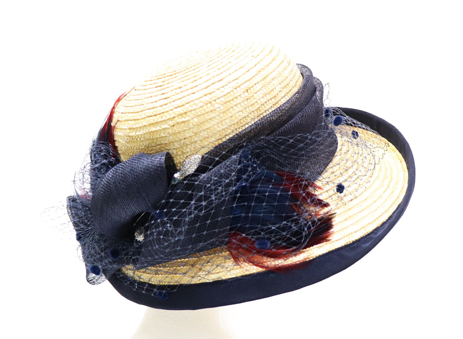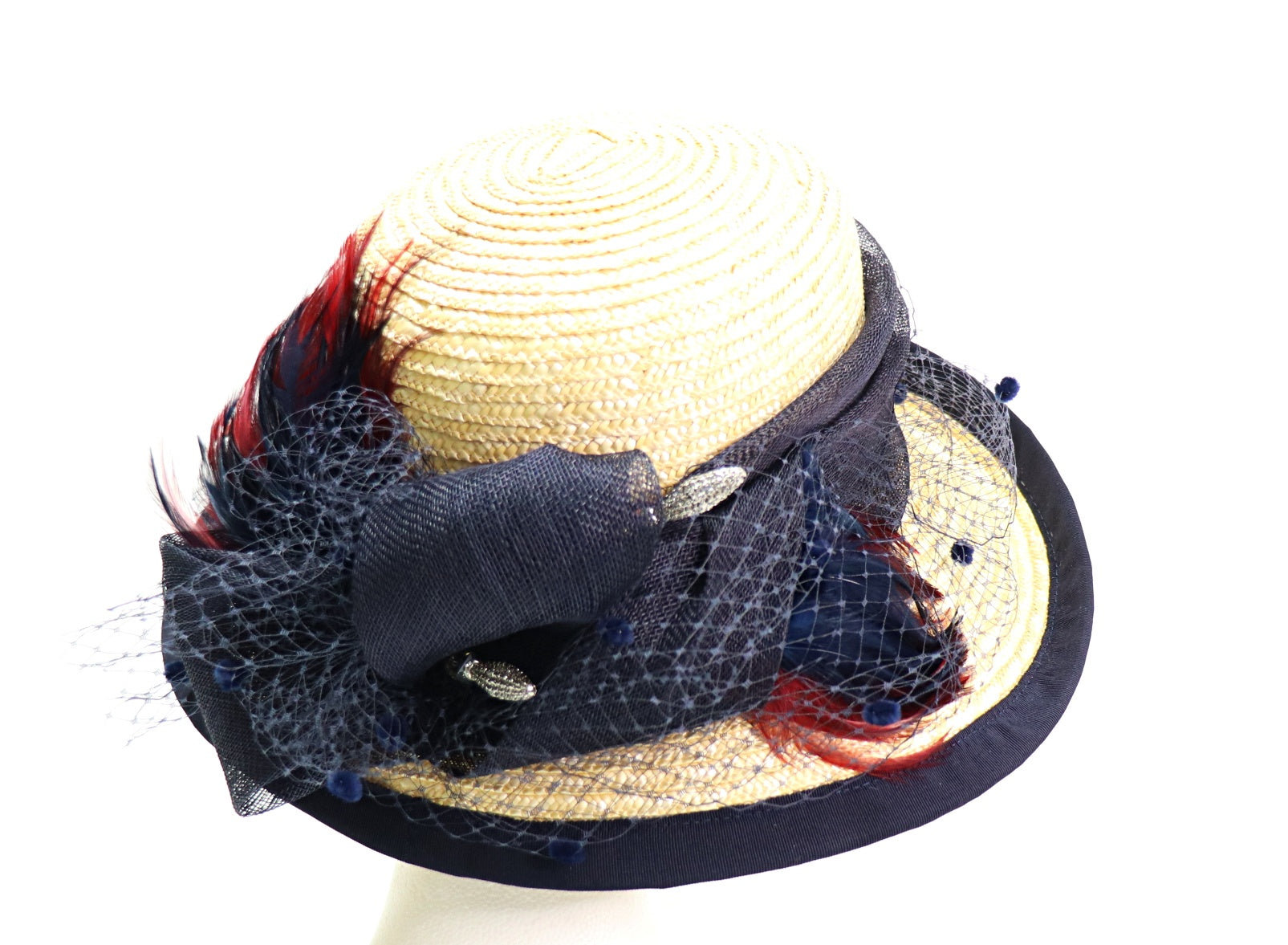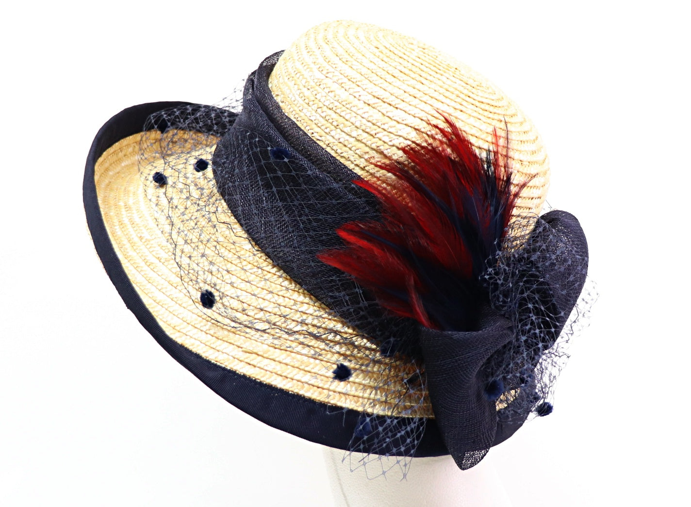 garniert mit dunkelblauem Sinamay - Tupfenschleier - blau und weinrot Federn