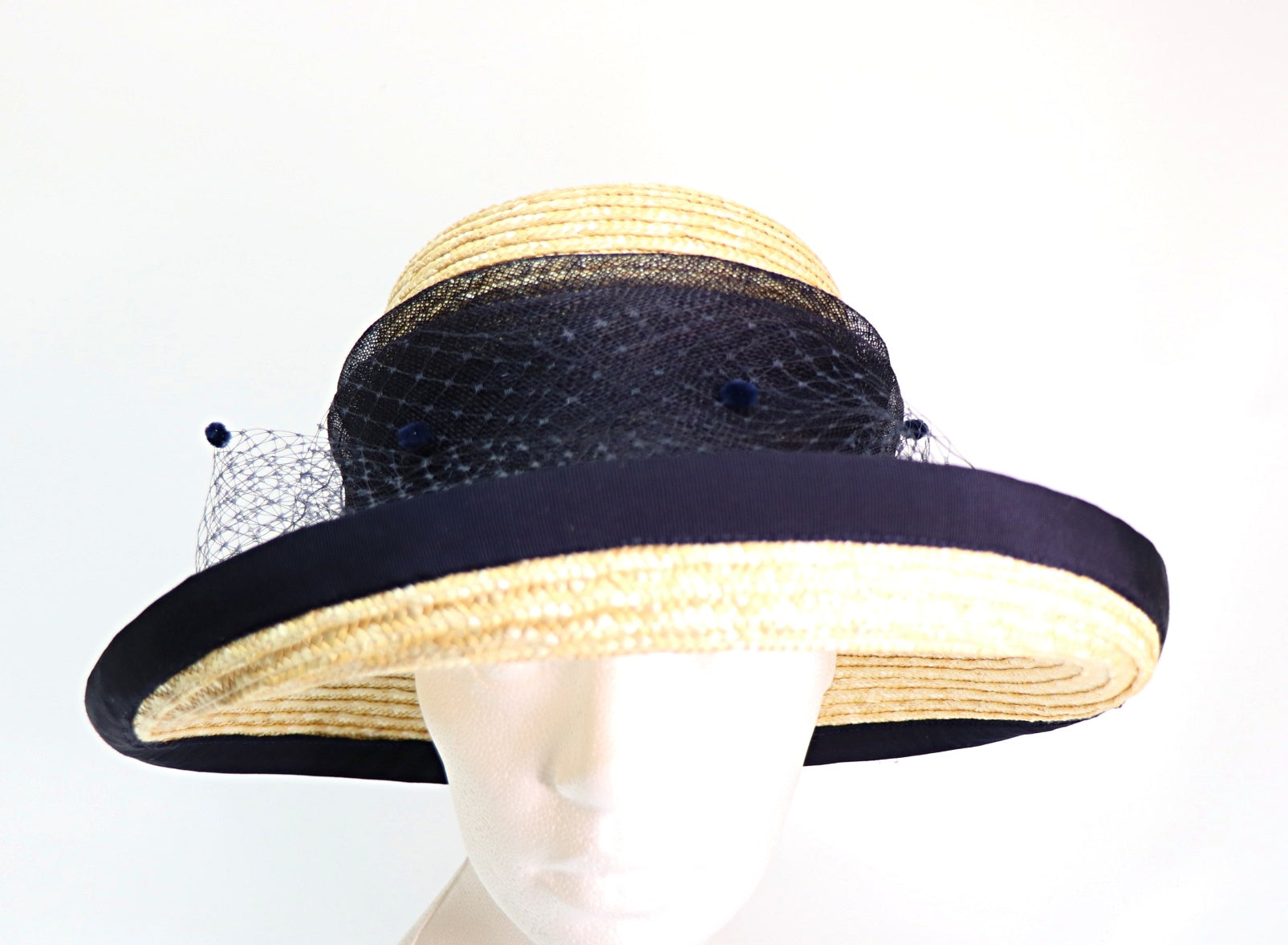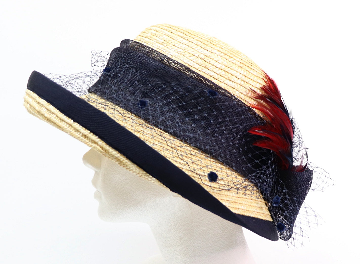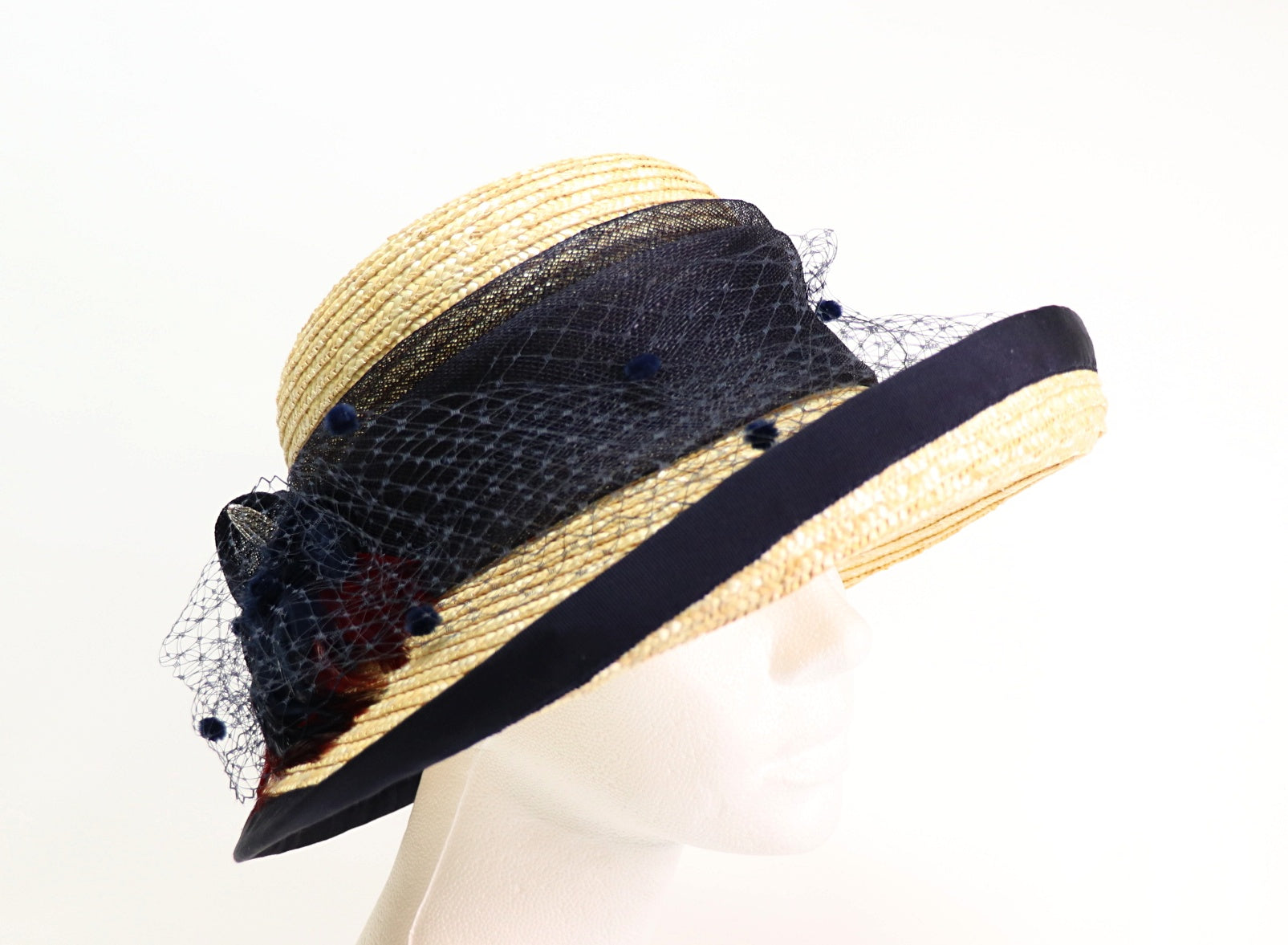 garniert mit dunkelblauem Sinamay - Tupfenschleier - blau und weinrot Federn