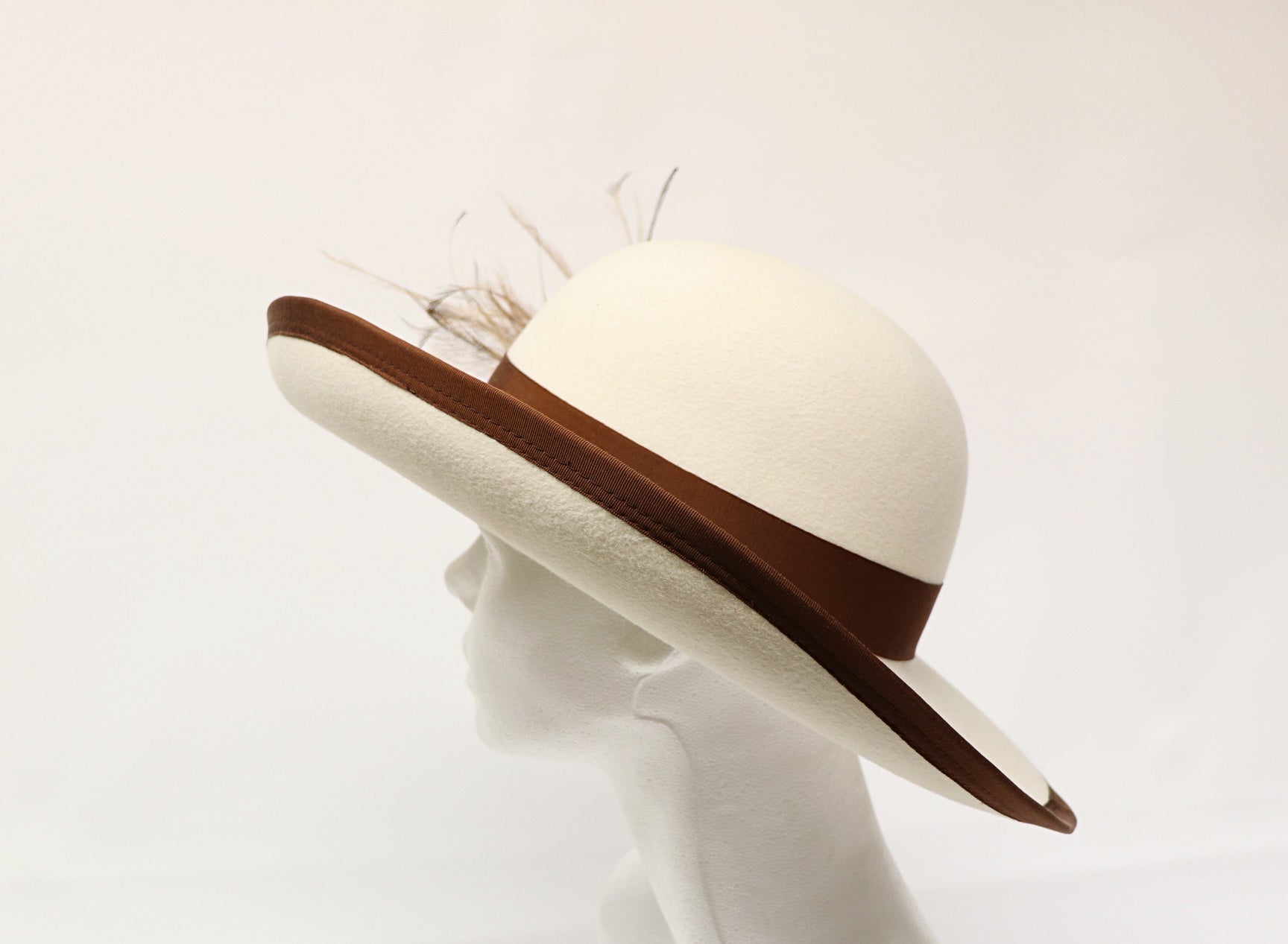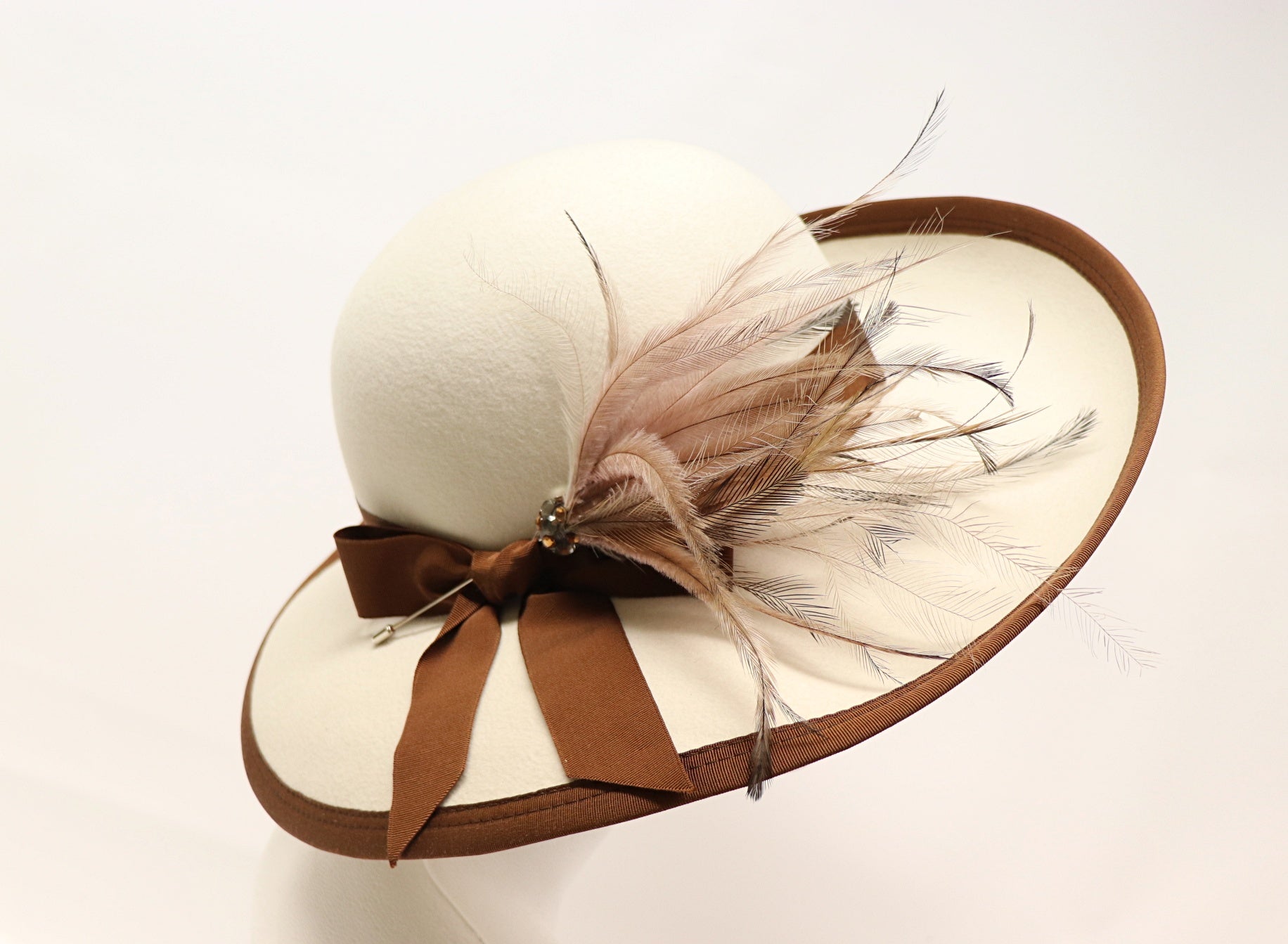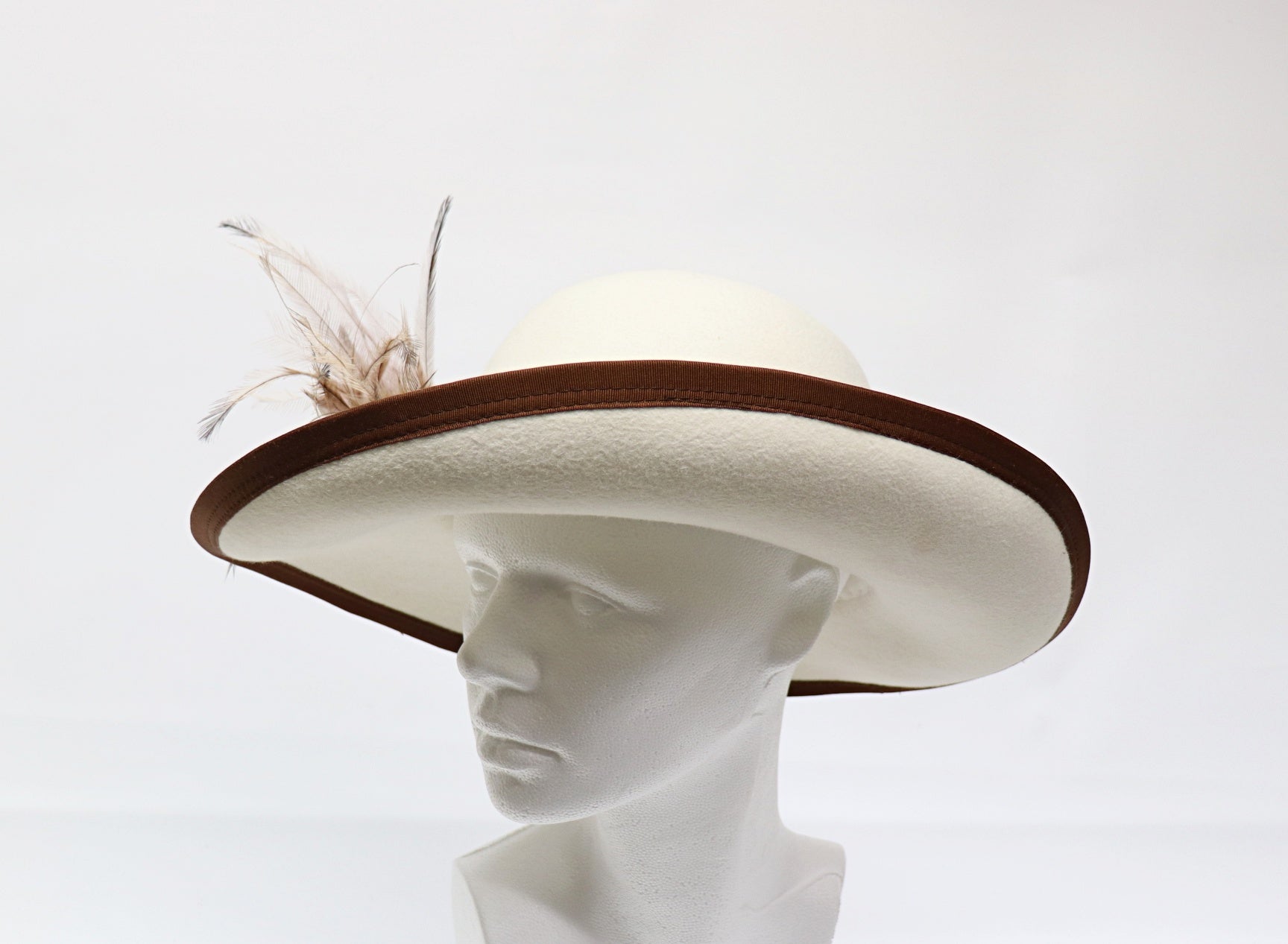 Filzhut creme - weiß mit rostbraun band und einer Emu Hutnadel