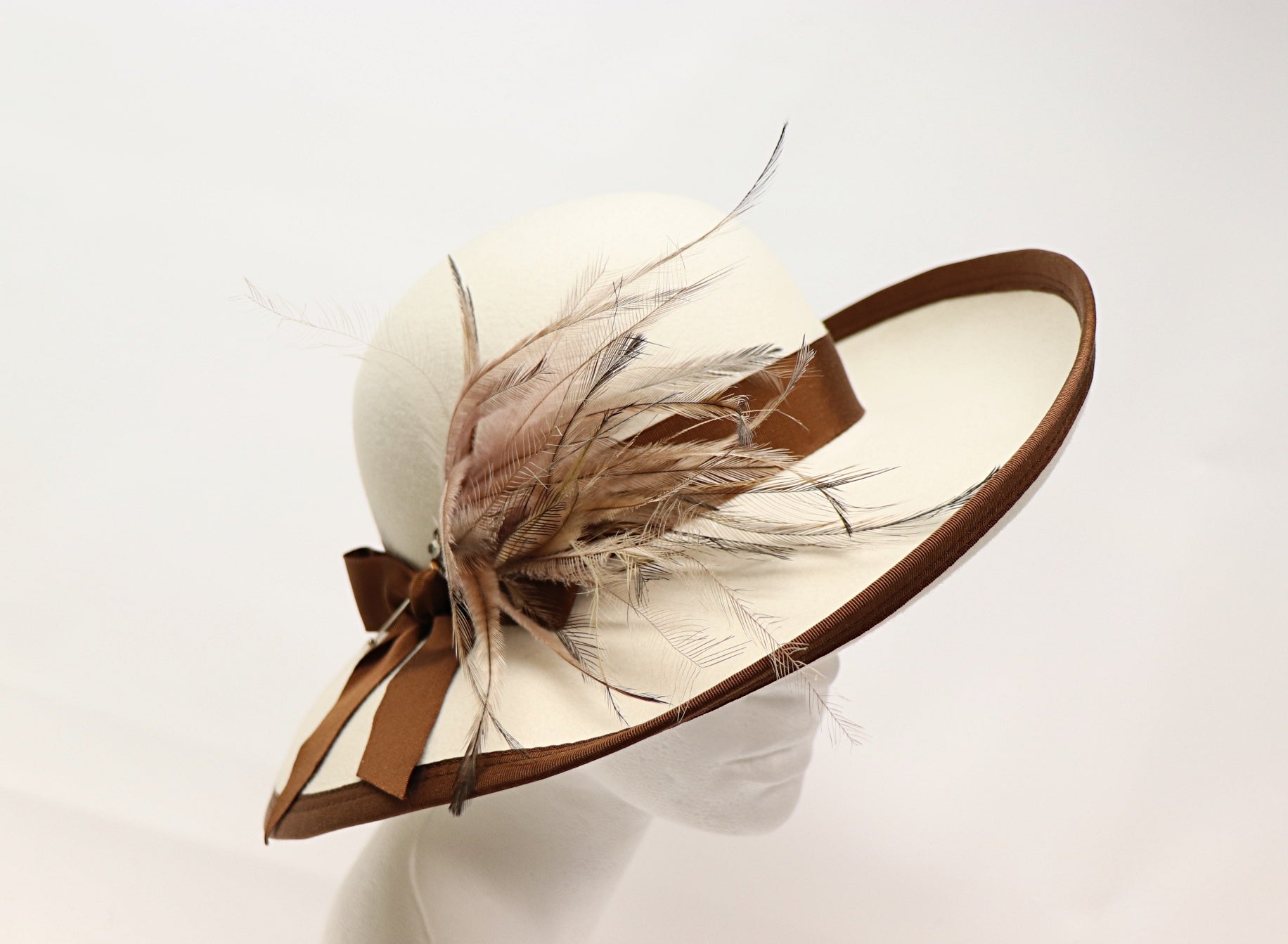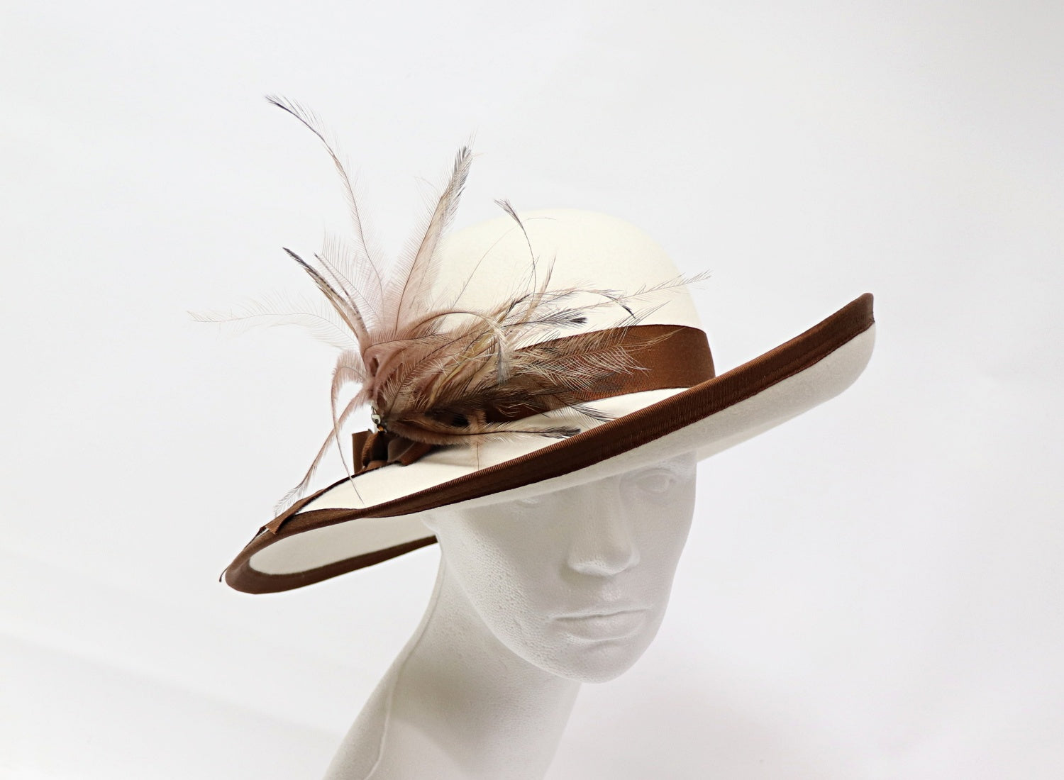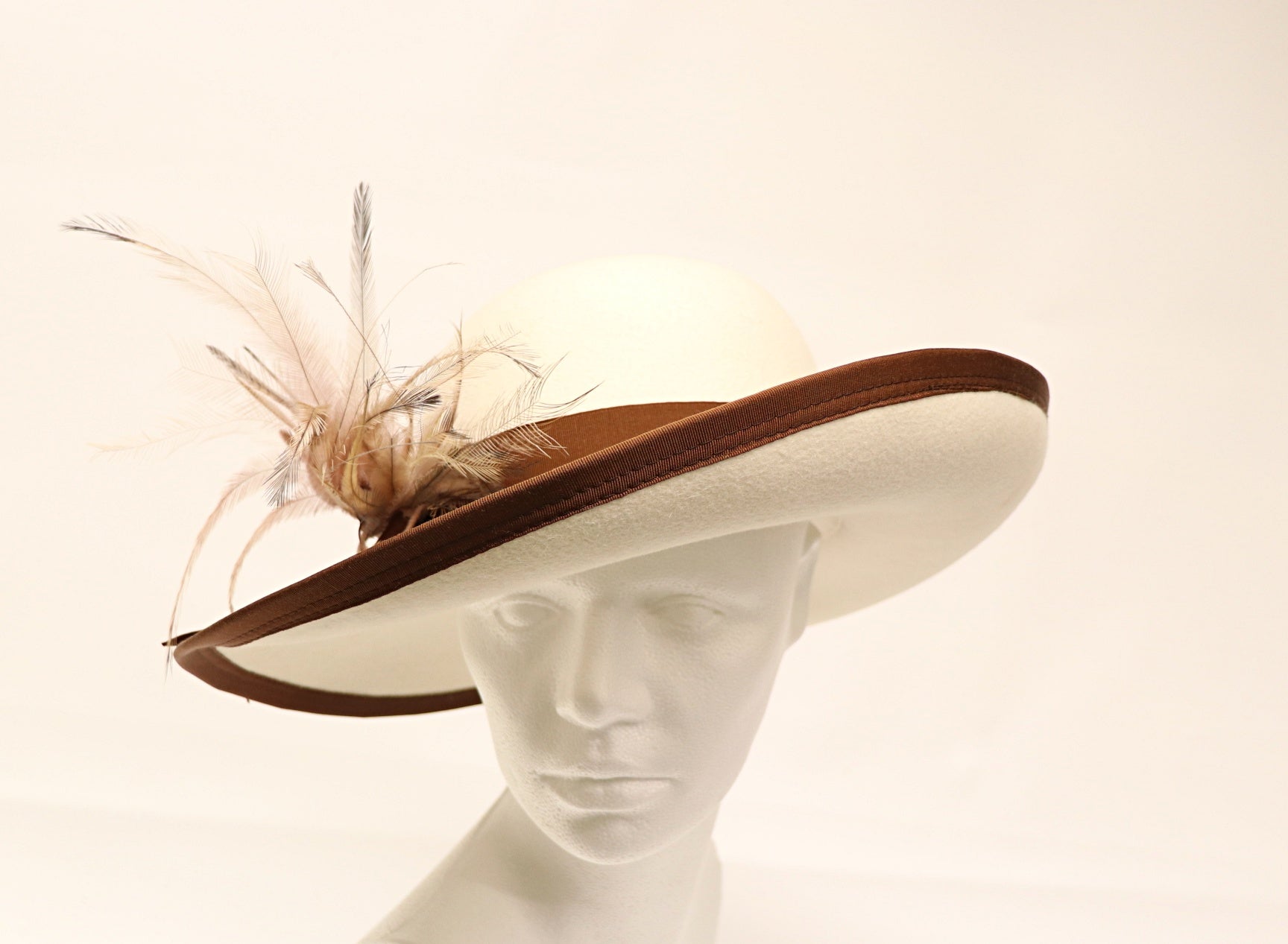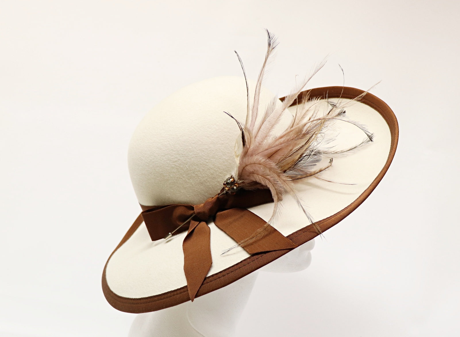Filzhut creme - weiß mit rostbraun band und einer Emu Hutnadel