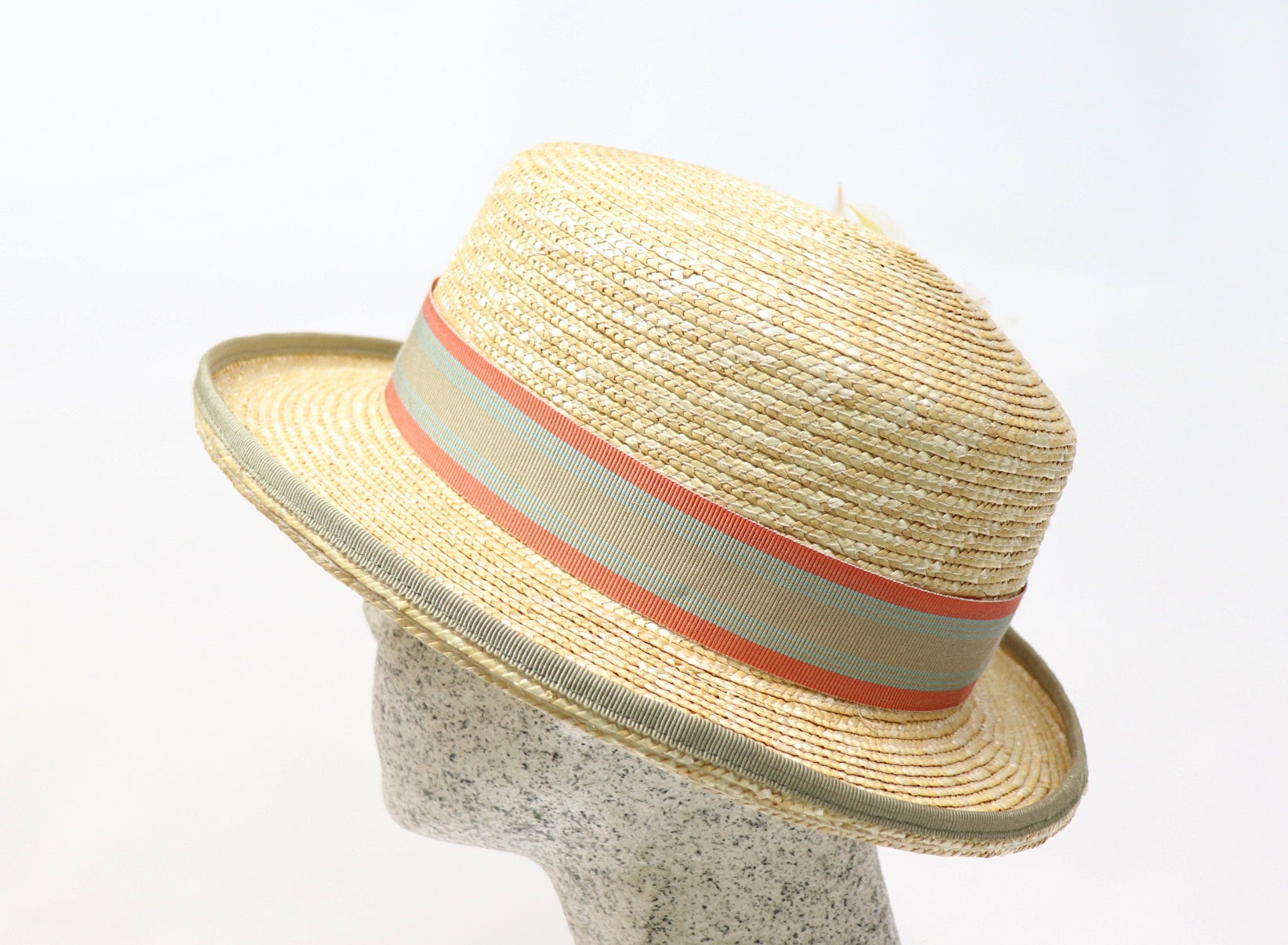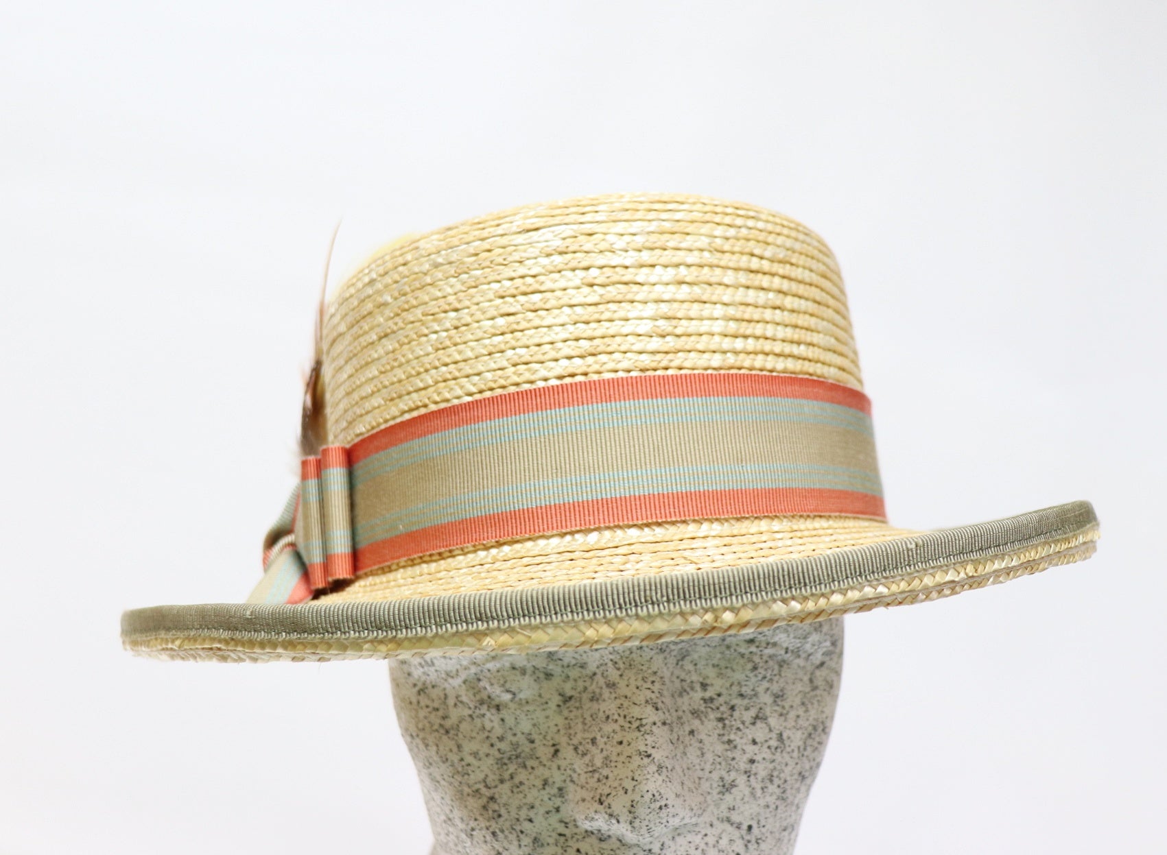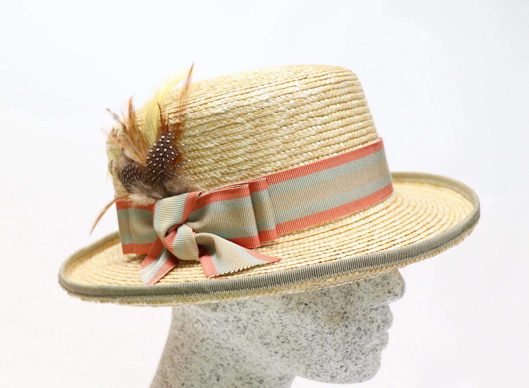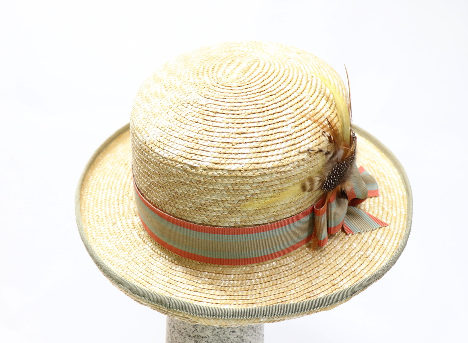 garniert mit einem Streifenband und einer kleinen Feder an der Seite