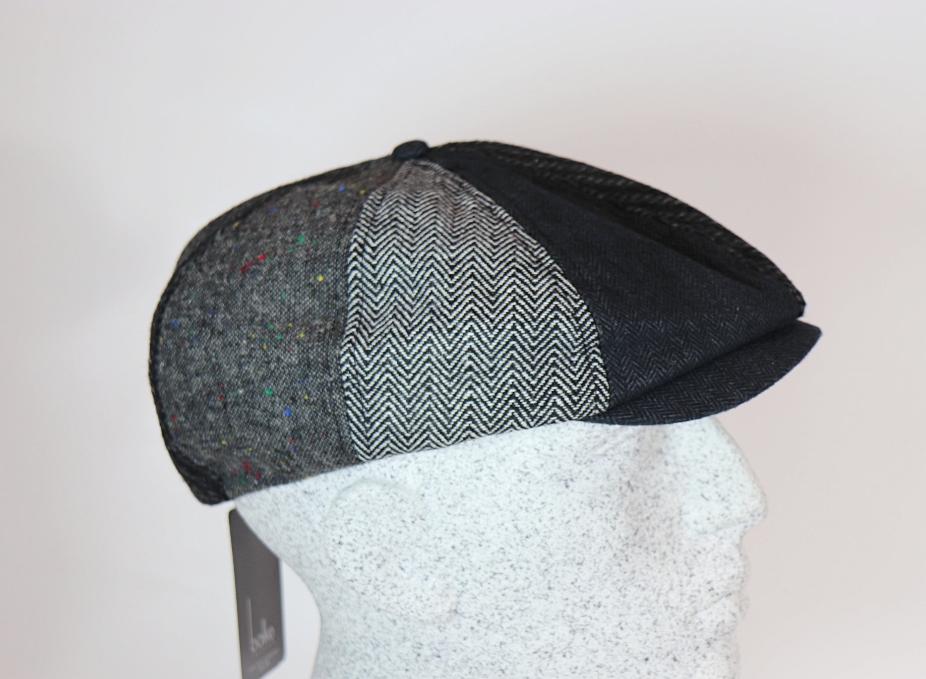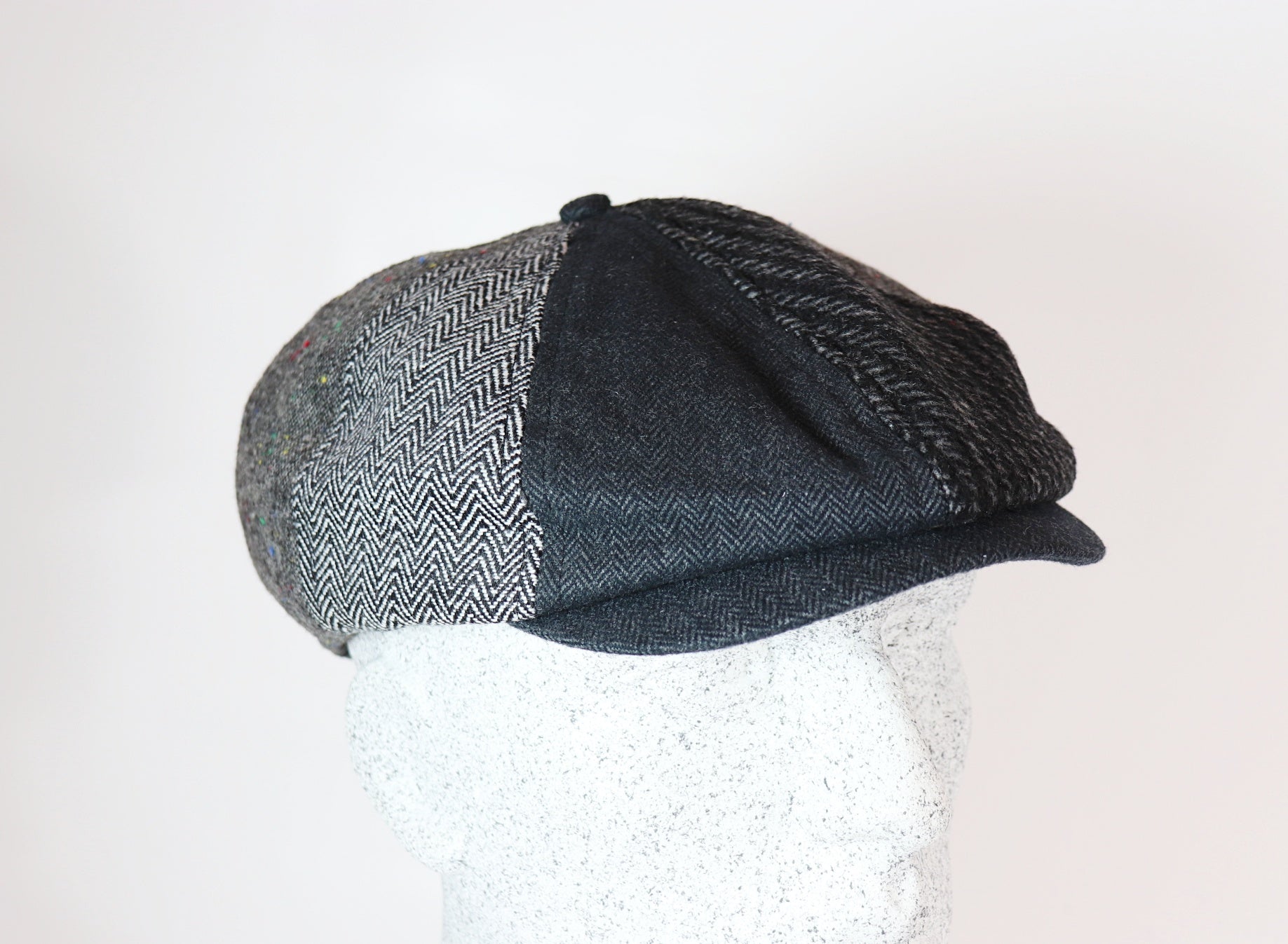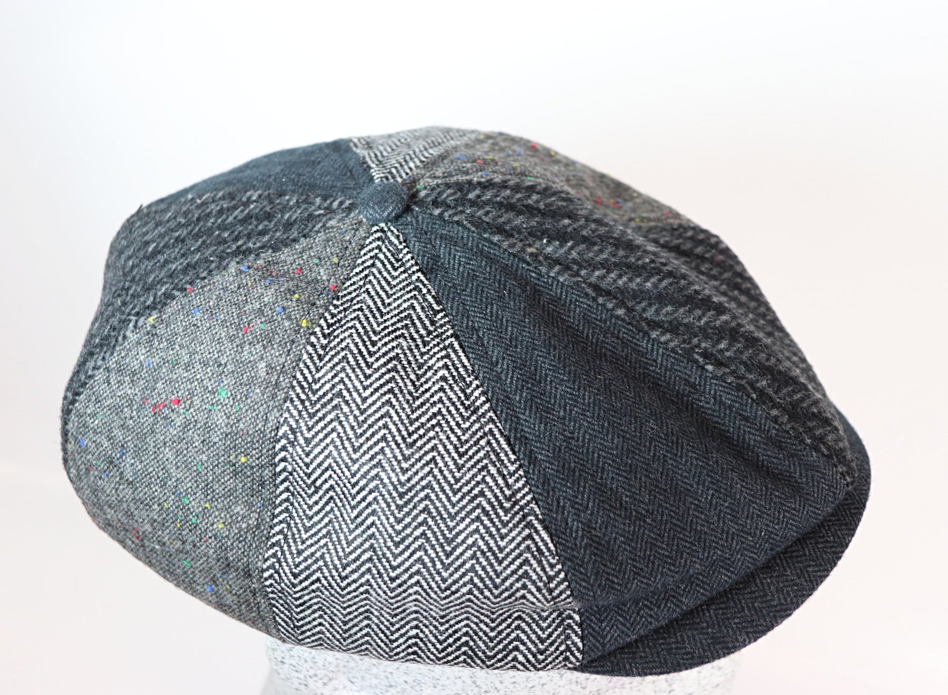 Schildmütze aus grau Tweed in Patchwork gearbeitet